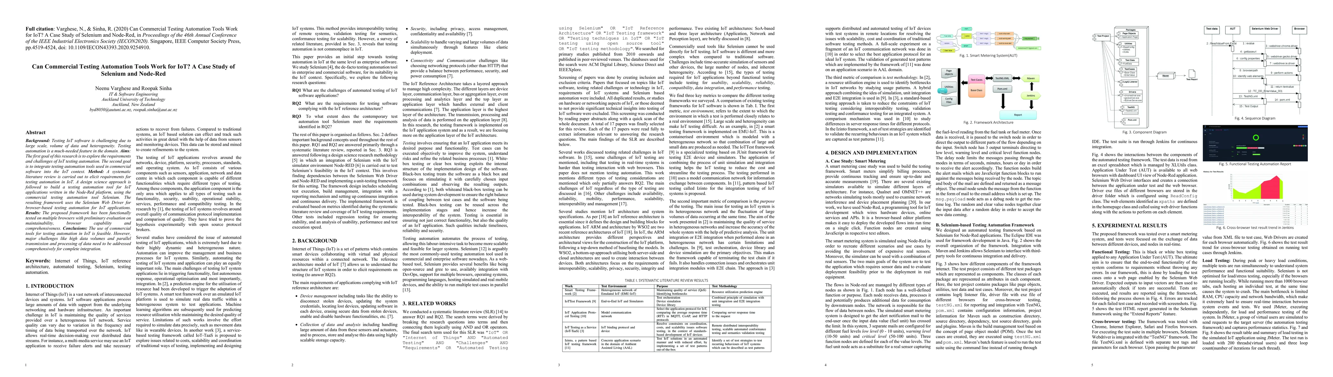 This study explores the feasibility of using commercial testing automation tools like Selenium for IoT applications, specifically within the Node-Red platform. The research concludes that while Selenium can be integrated, significant challenges remain regarding data volume and parallel data processing.