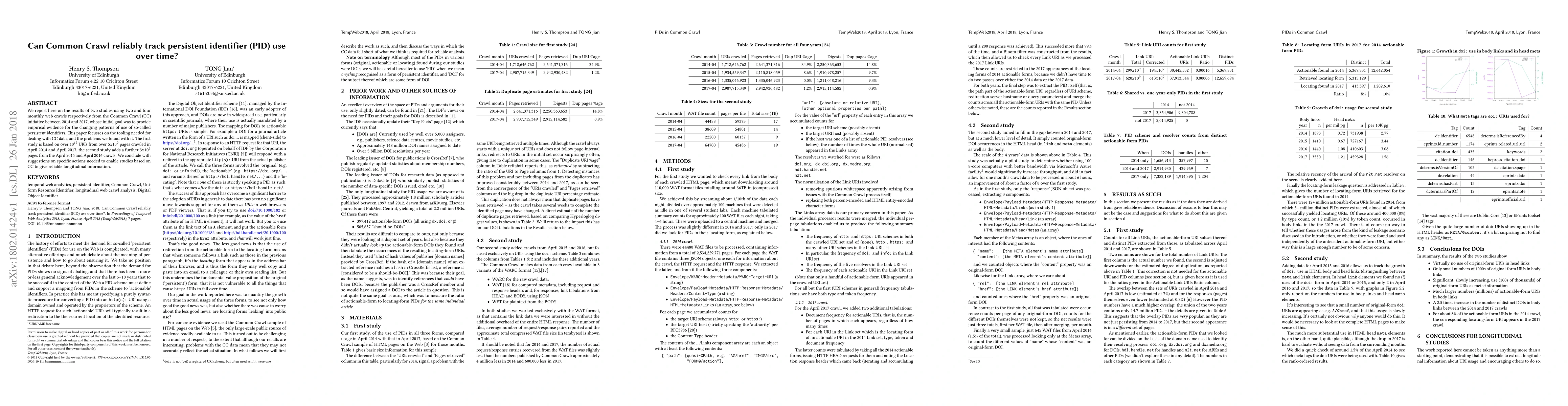 A study analyzed Common Crawl data to assess its reliability for tracking persistent identifier use over time. The researchers found issues with the tooling and data that hinder longitudinal information.
