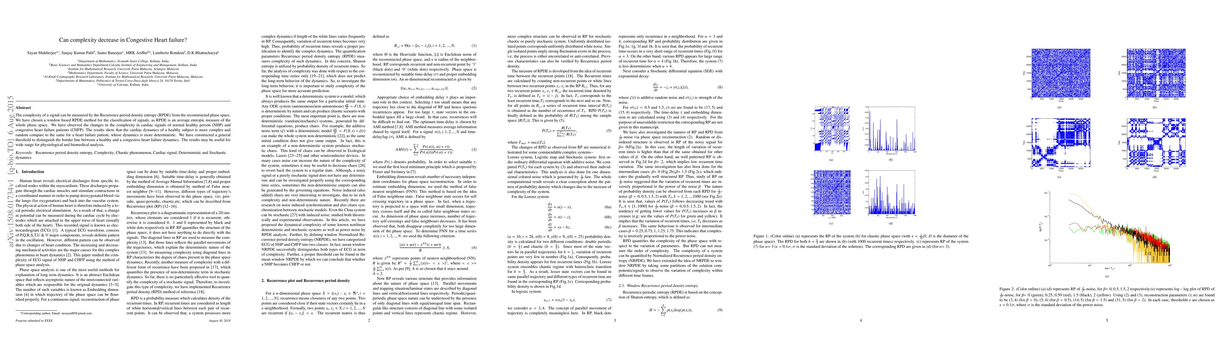 The study measures cardiac signal complexity using Recurrence Period Density Entropy (RPDE) and finds that healthy subjects exhibit more complex, random dynamics compared to congestive heart failure patients, whose signals are more deterministic. This distinction could aid in physiological and biomedical analysis.