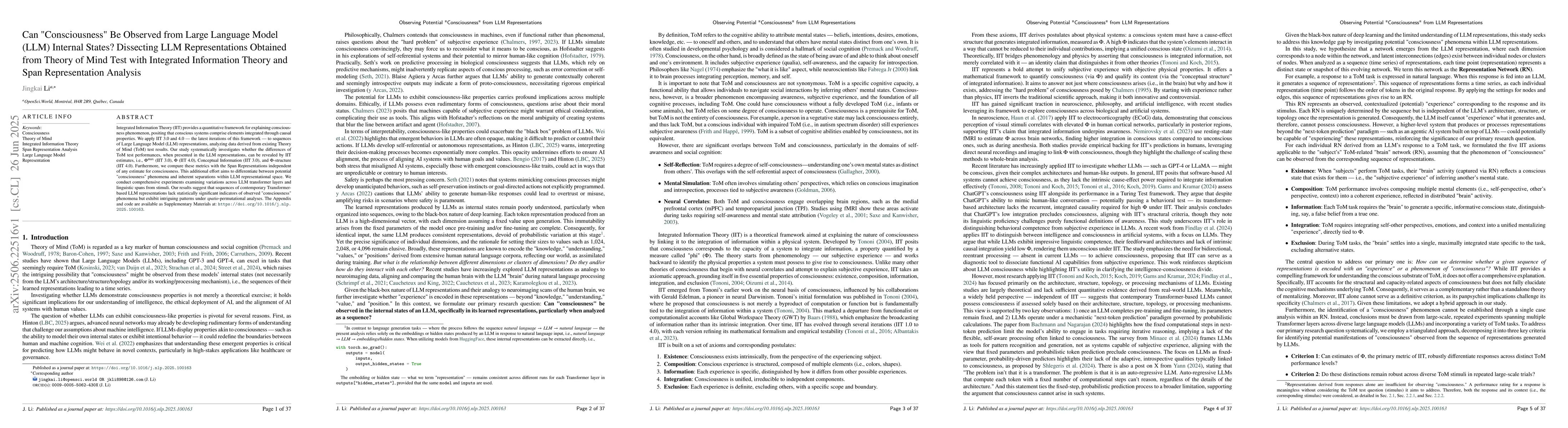 Integrated Information Theory (IIT) provides a quantitative framework for explaining consciousness phenomenon, positing that conscious systems comprise elements integrated through causal properties. We apply IIT 3.0 and 4.0 -- the latest iterations of this framework -- to sequences of Large Language Model (LLM) representations, analyzing data derived from existing Theory of Mind (ToM) test results. Our study systematically investigates whether the differences of ToM test performances, when presented in the LLM representations, can be revealed by IIT estimates, i.e., $\Phi^{\max}$ (IIT 3.0), $\Phi$ (IIT 4.0), Conceptual Information (IIT 3.0), and $\Phi$-structure (IIT 4.0). Furthermore, we compare these metrics with the Span Representations independent of any estimate for consciousness. This additional effort aims to differentiate between potential "consciousness" phenomena and inherent separations within LLM representational space. We conduct comprehensive experiments examining variations across LLM transformer layers and linguistic spans from stimuli. Our results suggest that sequences of contemporary Transformer-based LLM representations lack statistically significant indicators of observed "consciousness" phenomena but exhibit intriguing patterns under $\textit{spatio}$-permutational analyses. The Appendix and code are available as Supplementary Materials at: https://doi.org/10.1016/j.nlp.2025.100163.