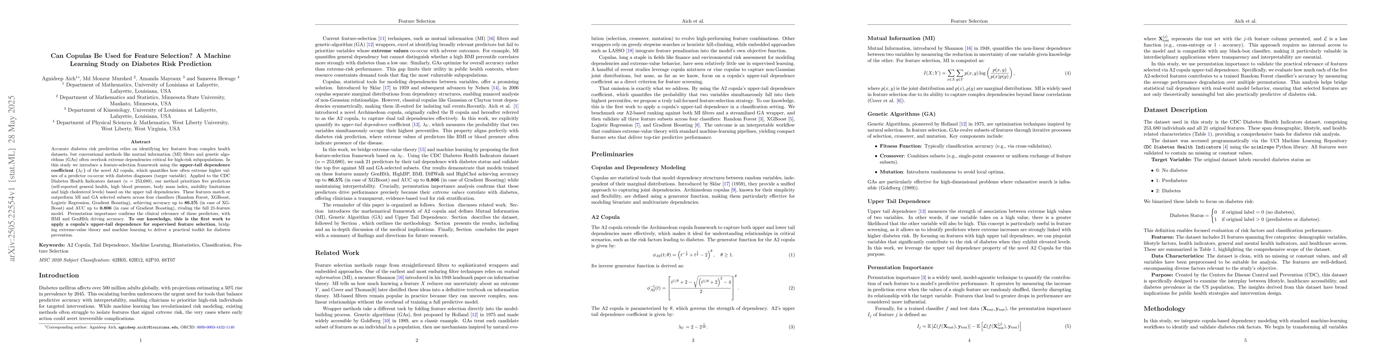 This is the first work to apply a copula's upper-tail dependence for supervised feature selection, offering a new perspective in bridging extreme-value theory and machine learning for diabetes risk prediction.