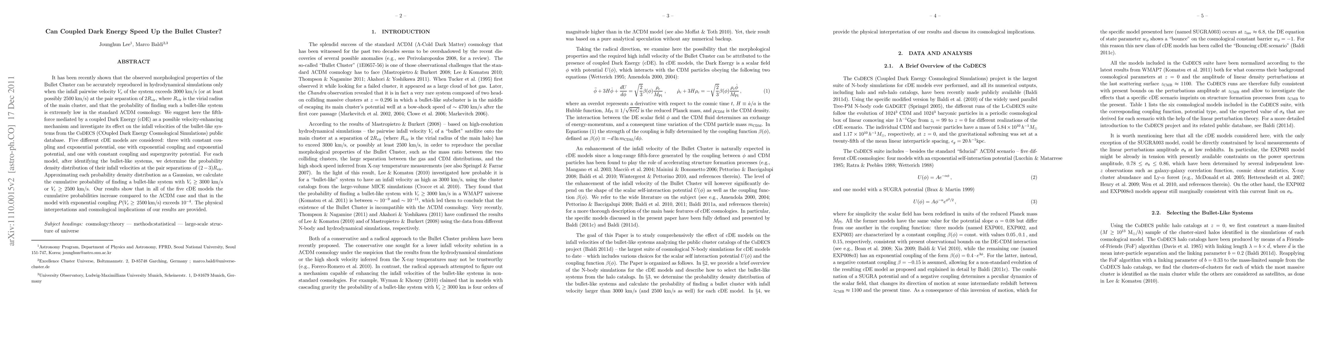 It has been recently shown that the observed morphological properties of the Bullet Cluster can be accurately reproduced in hydrodynamical simulations only when the infall pairwise velocity V_{c} of the system exceeds 3000km/s (or at least possibly 2500 km/s) at the pair separation of 2R_{vir}, where R_{vir} is the virial radius of the main cluster, and that the probability of finding such a bullet-like system is extremely low in the standard \Lambda CDM cosmology. We suggest here the fifth-force mediated by a coupled Dark Energy (cDE) as a possible velocity-enhancing mechanism and investigate its effect on the infall velocities of the bullet-like systems from the CoDECS (COupled Dark Energy Cosmological Simulations) public database. Five different cDE models are considered: three with constant coupling and exponential potential, one with exponential coupling and exponential potential, and one with constant coupling and supergravity potential. For each model, after identifying the bullet-like systems, we determine the probability density distribution of their infall velocities at the pair separations of (2-3)R_{vir}. Approximating each probability density distribution as a Gaussian, we calculate the cumulative probability of finding a bullet-like system with V_{c}>=3000 km/s or V_{c}>=2500 km/s. Our results show that in all of the five cDE models the cumulative probabilities increase compared to the \Lambda CDM case and that in the model with exponential coupling P(V_{c}>=2500 km/s) exceeds 10^{-4}. The physical interpretations and cosmological implications of our results are provided.