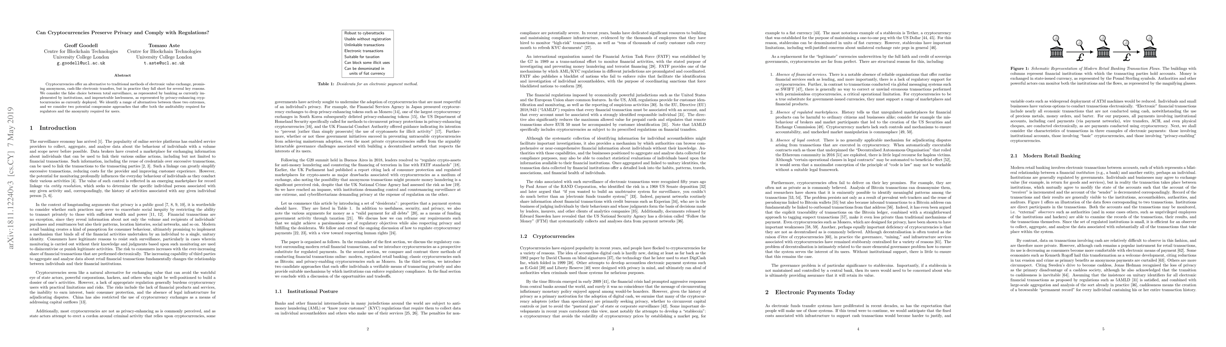 Cryptocurrencies offer an alternative to traditional methods of electronic value exchange, promising anonymous, cash-like electronic transfers, but in practice they fall short for several key reasons. We consider the false choice between total surveillance, as represented by banking as currently implemented by institutions, and impenetrable lawlessness, as represented by privacy-enhancing cryptocurrencies as currently deployed. We identify a range of alternatives between those two extremes, and we consider two potential compromise approaches that offer both the auditability required for regulators and the anonymity required for users.