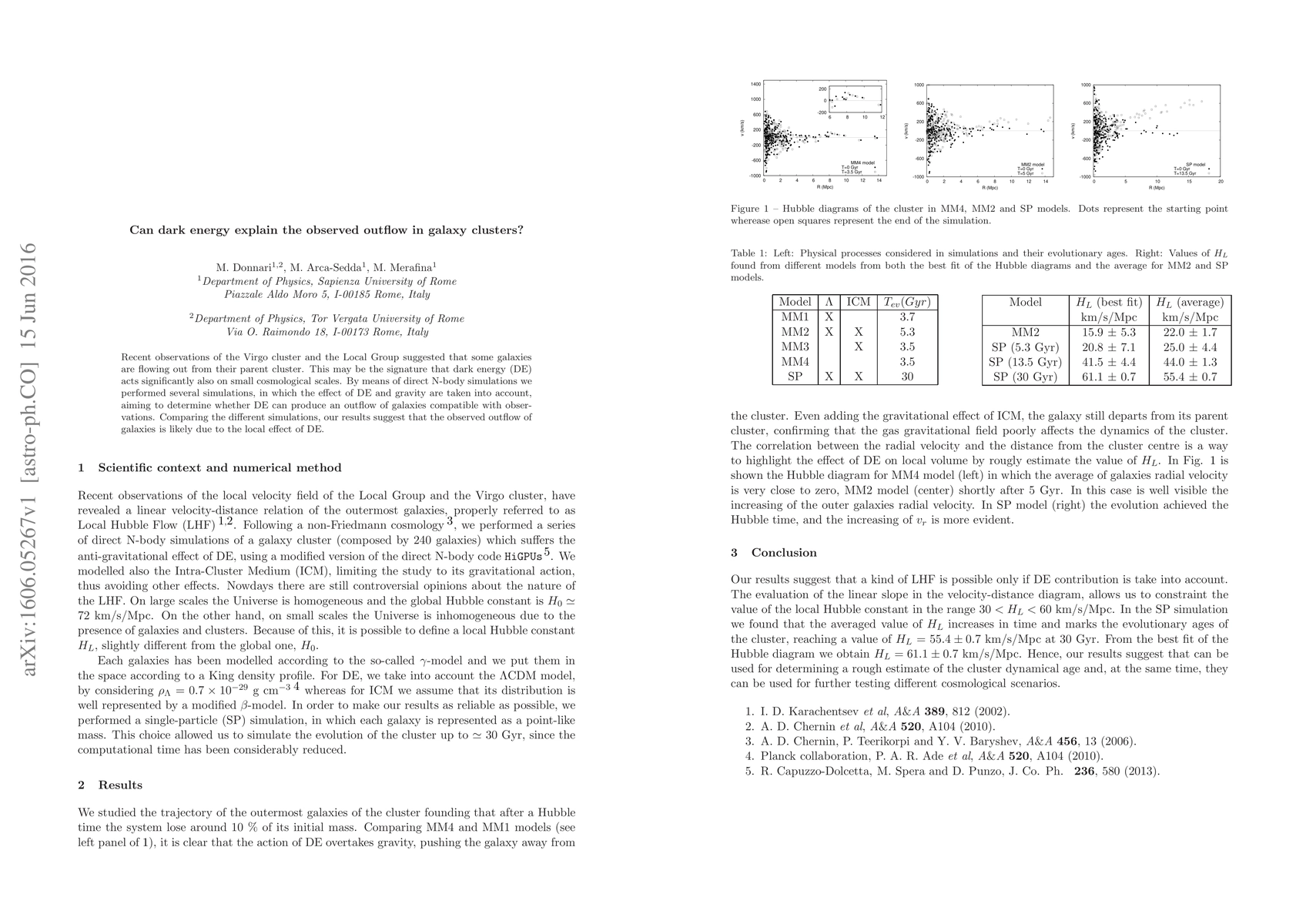Recent observations of the Virgo cluster and the Local Group suggested that some galaxies are flowing out from their parent cluster. This may be the signature that dark energy (DE) acts significantly also on small cosmological scales. By means of direct N-body simulations we performed several simulations, in which the effect of DE and gravity are taken into account, aiming to determine whether DE can produce an outflow of galaxies compatible with observations. Comparing the different simulations, our results suggest that the observed outflow of galaxies is likely due to the local effect of DE.