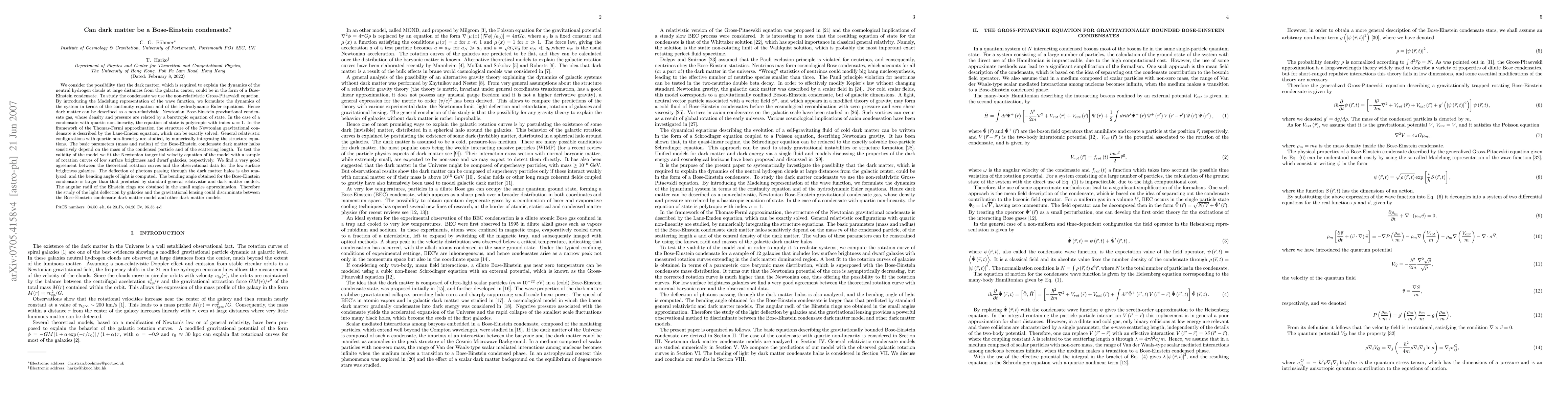This paper explores the hypothesis that dark matter could be a Bose-Einstein condensate, modeled using the non-relativistic Gross-Pitaevskii equation. The study finds good agreement between the model's rotation curves and observational data for low surface brightness galaxies, suggesting the potential of gravitational lensing to distinguish this model from others.