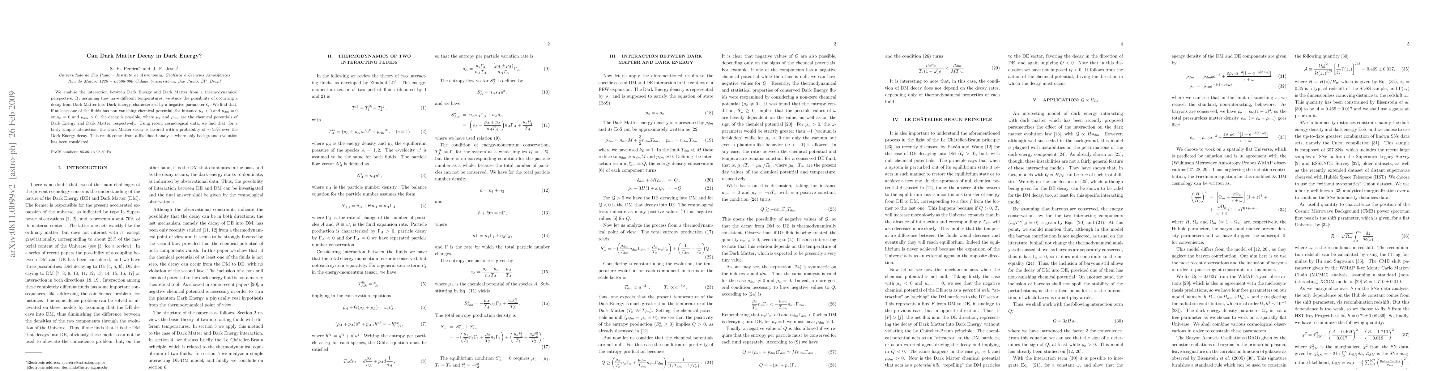 This paper explores the thermodynamic interaction between Dark Energy and Dark Matter, suggesting that Dark Matter decay into Dark Energy is possible if one fluid has a non-vanishing chemical potential. The analysis favors Dark Matter decay with a probability of approximately 93% based on recent cosmological data and a likelihood analysis considering only background evolution.