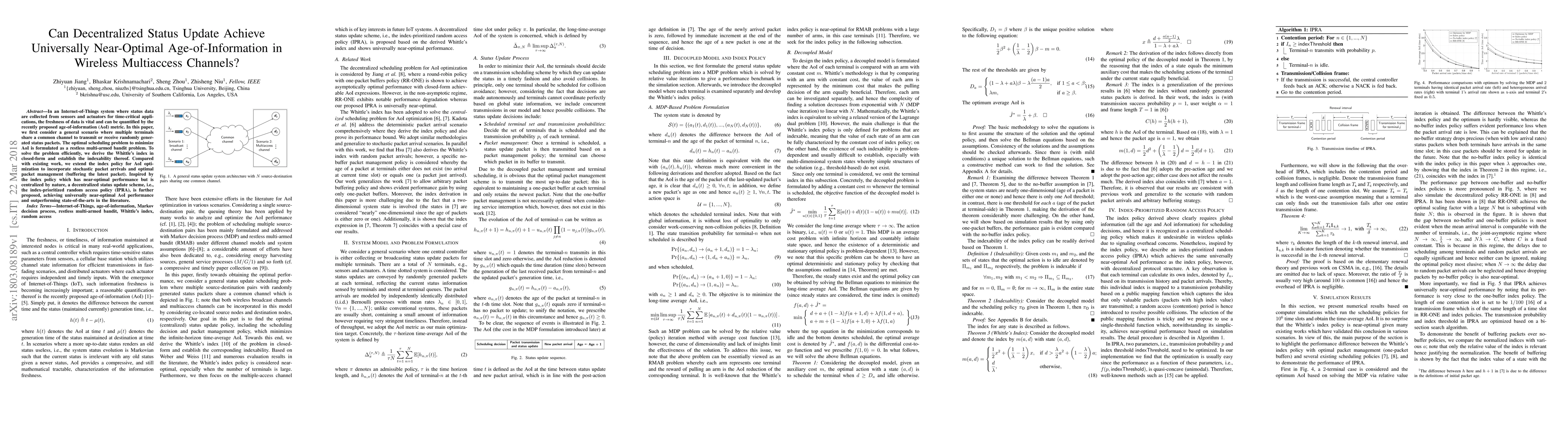 This paper investigates a decentralized scheme for minimizing the age-of-information (AoI) in wireless multiaccess channels, proposing the index-prioritized random access policy (IPRA) to achieve near-optimal performance without central coordination, outperforming existing centralized solutions.