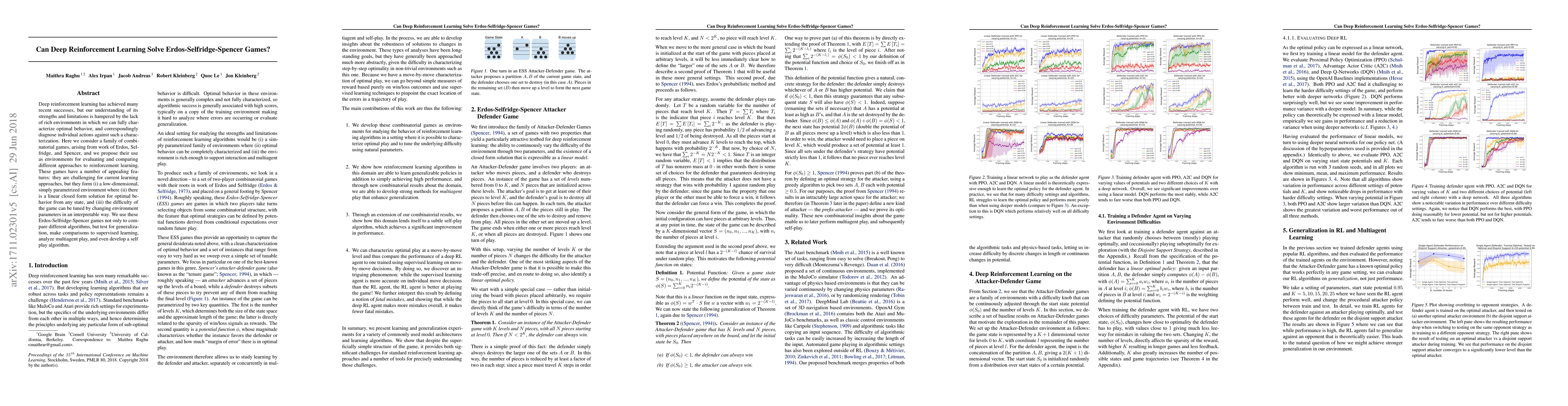 This paper explores the application of deep reinforcement learning to Erdos-Selfridge-Spencer games, using them as testbeds to evaluate and compare various reinforcement learning algorithms, analyze generalization, and study multiagent play. The games offer a low-dimensional environment with a known optimal solution, allowing for detailed diagnostic analysis.