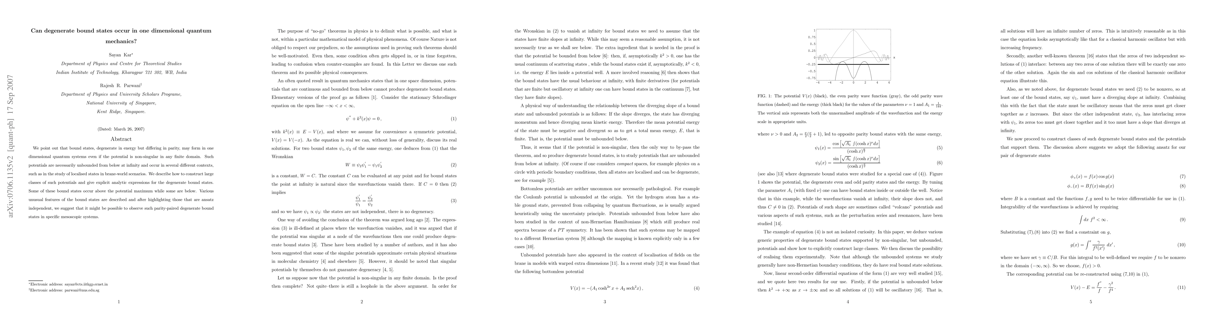 This paper explores the possibility of degenerate bound states in one-dimensional quantum mechanics, demonstrating that such states can exist even in non-singular potentials unbounded from below. It provides explicit examples and suggests potential observation in mesoscopic systems.