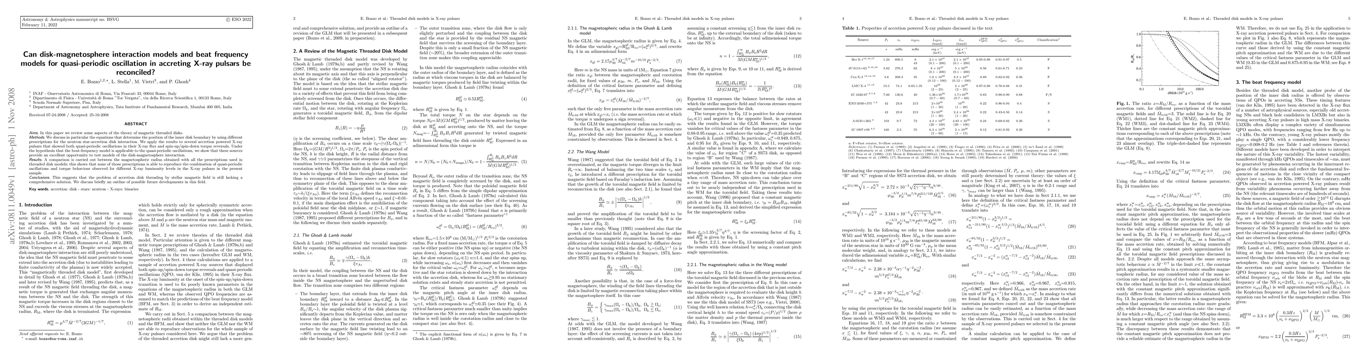 In this paper we review some aspects of the theory of magnetic threaded disks. We discuss in particular the equations that determine the position of the inner disk boundary by using different prescriptions for the neutron star-accretion disk interaction. We apply the results to several accretion powered X-ray pulsars that showed both quasi-periodic oscillations in their X-ray flux and spin-up/spin-down torque reversals. Under the hypothesis that the beat-frequency model is applicable to the quasi-periodic oscillations, we show that these sources provide an excellent opportunity to test models of the disk-magnetosphere interaction. A comparison is carried out between the magnetospheric radius obtained with all the prescriptions used in threaded disk models; this shows that none of those prescriptions is able to reproduce the combination of quasi-periodic oscillations and torque behaviour observed for different X-ray luminosity levels in the X-ray pulsars in the present sample. This suggests that the problem of accretion disk threading by stellar magnetic field is still lacking a comprehensive solution. We discuss briefly an outline of possible future developments in this field.