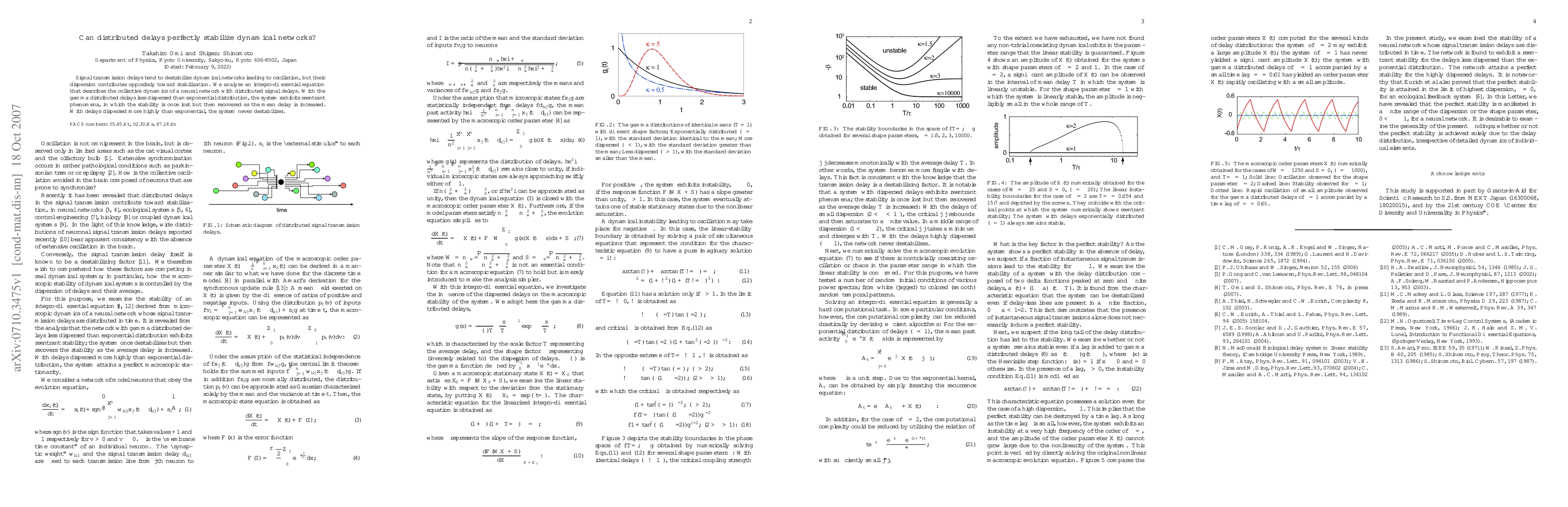 Signal transmission delays tend to destabilize dynamical networks leading to oscillation, but their dispersion contributes oppositely toward stabilization. We analyze an integro-differential equation that describes the collective dynamics of a neural network with distributed signal delays. With the gamma distributed delays less dispersed than exponential distribution, the system exhibits reentrant phenomena, in which the stability is once lost but then recovered as the mean delay is increased. With delays dispersed more highly than exponential, the system never destabilizes.