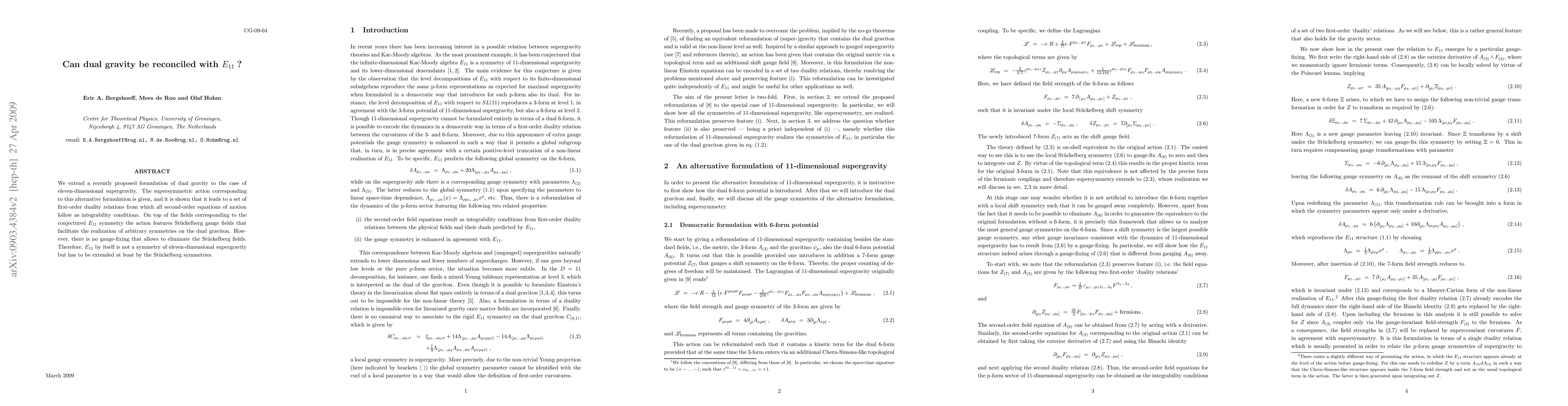 Researchers extended a dual gravity theory to eleven-dimensional supergravity, finding that E11 symmetry requires extension with Stuckelberg gauge fields.