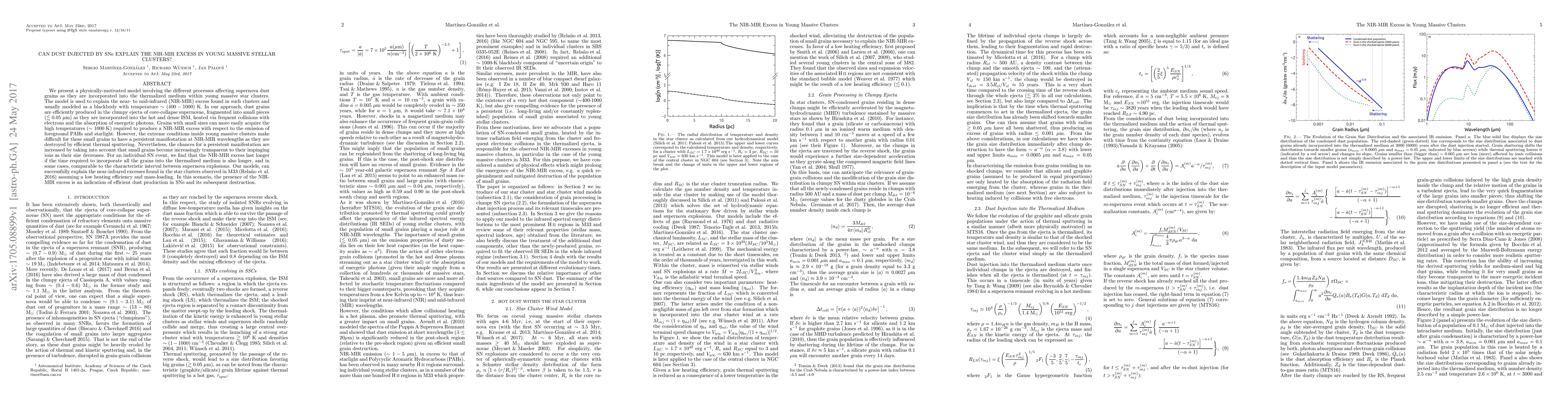 We present a physically-motivated model involving the different processes affecting supernova dust grains as they are incorporated into the thermalized medium within young massive star clusters. The model is used to explain the near- to mid-infrared (NIR-MIR) excess found in such clusters and usually modeled as a blackbody with temperature $\sim (400-1000)$ K. In our approach, dust grains are efficiently produced in the clumpy ejecta of core-collapse supernovae, fragmented into small pieces ($\lesssim 0.05$ $\mu$m) as they are incorporated into the hot and dense ISM, heated via frequent collisions with electrons and the absorption of energetic photons. Grains with small sizes can more easily acquire the high temperatures ($\sim 1000$ K) required to produce a NIR-MIR excess with respect to the emission of foreground PAHs and starlight. However, the extreme conditions inside young massive clusters make difficult for these small grains to have a persistent manifestation at NIR-MIR wavelengths as they are destroyed by efficient thermal sputtering. Nevertheless, the chances for a persistent manifestation are increased by taking into account that small grains become increasingly transparent to their impinging ions as their size decreases. For an individual SN event, we find that the NIR-MIR excess last longer if the time required to incorporate all the grains into the thermalized medium is also longer, and in some cases, comparable to the characteristic interval between supernova explosions. Our models, can successfully explain the near-infrared excesses found in the star clusters observed in M33 (Rela\~no et al. 2016) assuming a low heating efficiency and mass-loading. In this scenario, the presence of the NIR-MIR excess is an indication of efficient dust production in SNe and its subsequent destruction