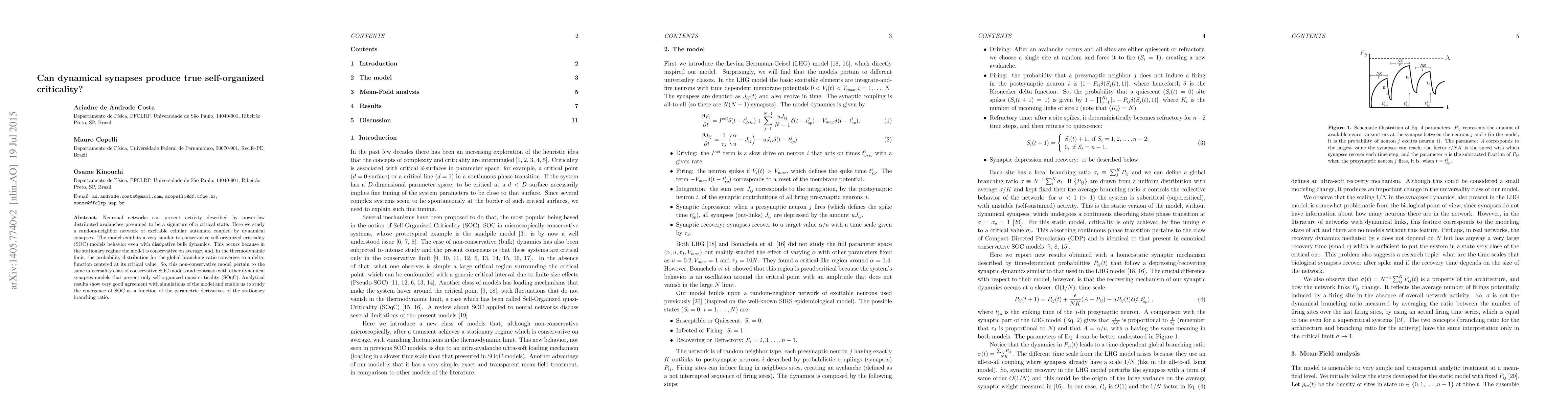 This paper investigates whether dynamical synapses in a random-neighbor network of excitable cellular automata can achieve true self-organized criticality (SOC). The model demonstrates behavior similar to conservative SOC models, indicating that it belongs to the same universality class despite its dissipative nature.