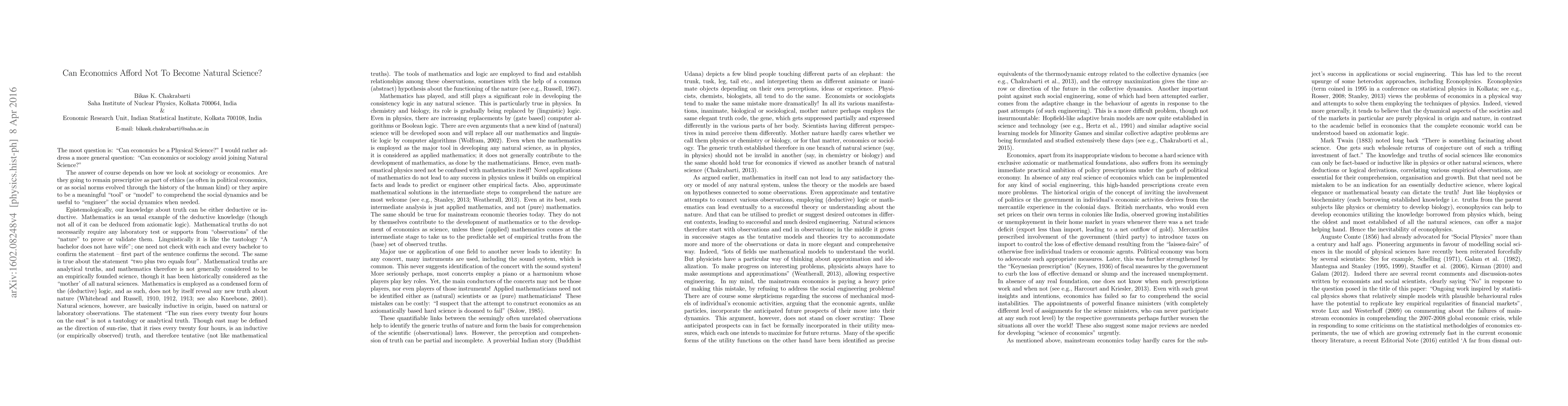 The 'Discussion & Debate' issue of this Euro. Phys. J. Special Topic volume is: 'Can economics be a Physical Science?' I would rather address a more general question: 'Can economics or sociology avoid joining Natural Science?' and argue that mainstream or core economics or sociology can not escape joining natural science.