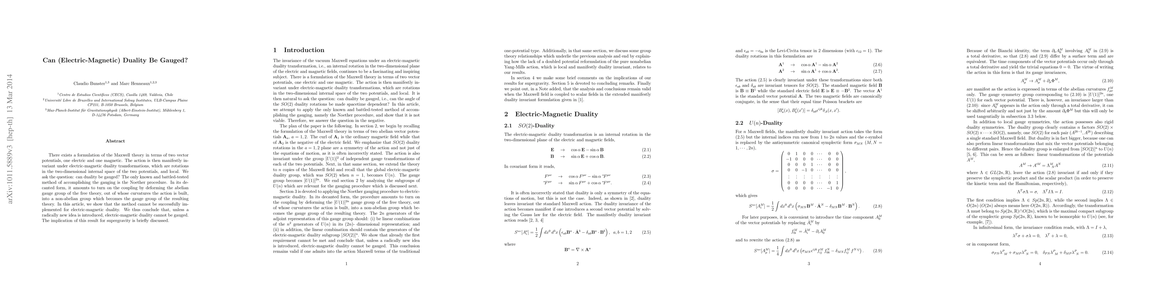 There exists a formulation of the Maxwell theory in terms of two vector potentials, one electric and one magnetic. The action is then manifestly invariant under electric-magnetic duality transformations, which are rotations in the two-dimensional internal space of the two potentials, and local. We ask the question: can duality be gauged? The only known and battled-tested method of accomplishing the gauging is the Noether procedure. In its decanted form, it amounts to turn on the coupling by deforming the abelian gauge group of the free theory, out of whose curvatures the action is built, into a non-abelian group which becomes the gauge group of the resulting theory. In this article, we show that the method cannot be successfully implemented for electric-magnetic duality. We thus conclude that, unless a radically new idea is introduced, electric-magnetic duality cannot be gauged. The implication of this result for supergravity is briefly discussed.
