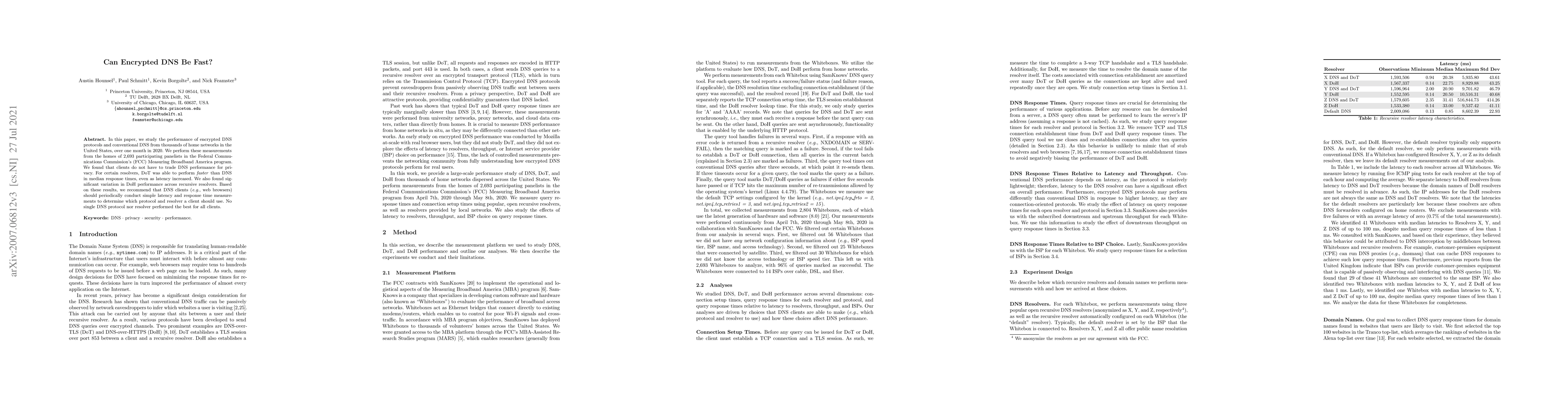 This paper investigates the performance of encrypted DNS protocols versus conventional DNS across thousands of home networks in the U.S. It found that, contrary to common belief, encrypted DNS can achieve faster response times than conventional DNS for some resolvers, though performance varies significantly. The authors recommend DNS clients conduct periodic performance tests to choose the best protocol and resolver.