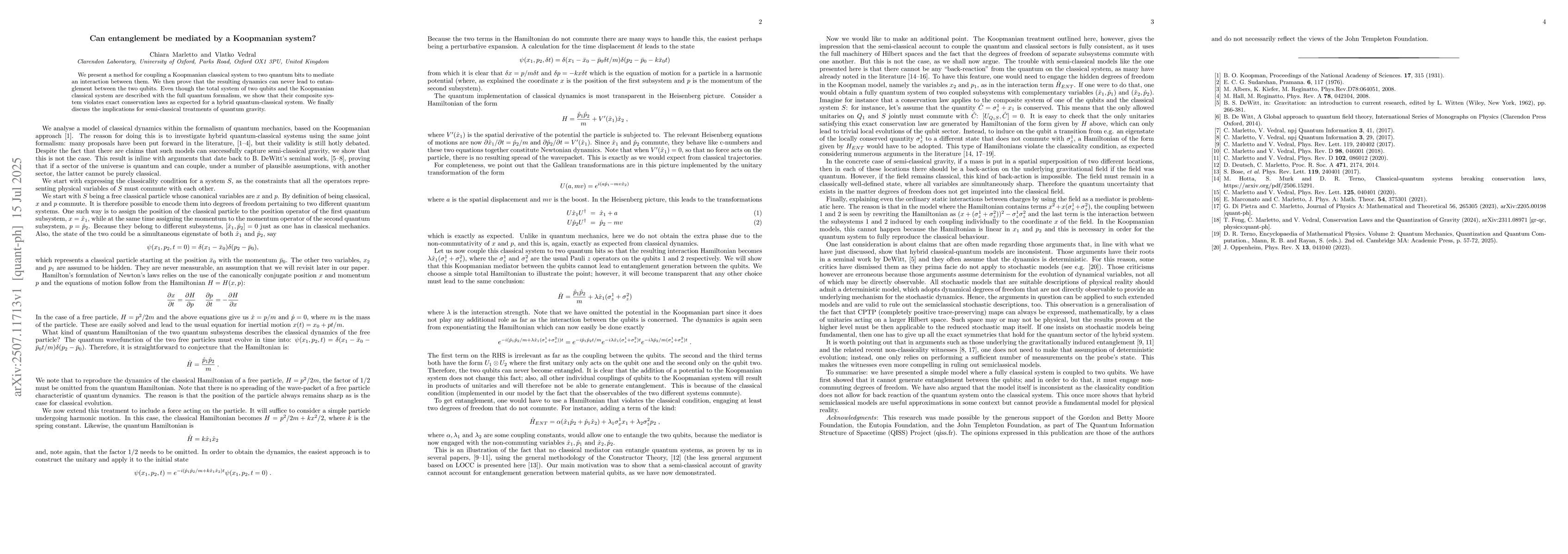 We present a method for coupling a Koopmanian classical system to two quantum bits to mediate an interaction between them. We then prove that the resulting dynamics can never lead to entanglement between the two qubits. Even though the total system of two qubits and the Koopmanian classical system are described with the full quantum formalism, we show that their composite system violates exact conservation laws as expected for a hybrid quantum-classical system. We finally discuss the implications for semi-classical treatments of quantum gravity.