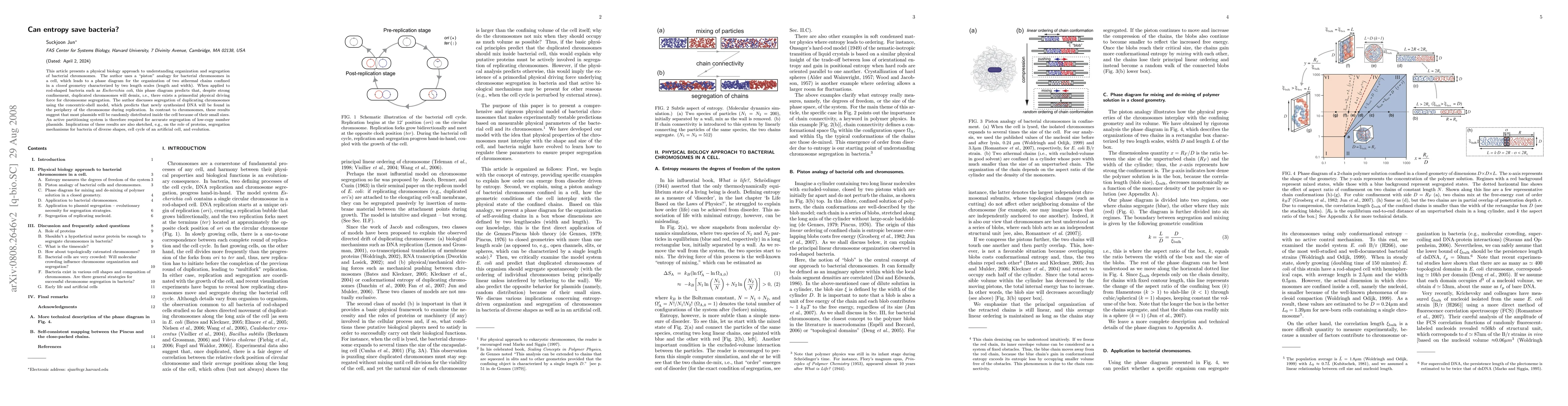 This article presents a physical biology approach to understanding organization and segregation of bacterial chromosomes. The author uses a "piston" analogy for bacterial chromosomes in a cell, which leads to a phase diagram for the organization of two athermal chains confined in a closed geometry characterized by two length scales (length and width). When applied to rod-shaped bacteria such as Escherichia coli, this phase diagram predicts that, despite strong confinement, duplicated chromosomes will demix, i.e., there exists a primordial physical driving force for chromosome segregation. The author discusses segregation of duplicating chromosomes using the concentric-shell model, which predicts that newly synthesized DNA will be found in the periphery of the chromosome during replication. In contrast to chromosomes, these results suggest that most plasmids will be randomly distributed inside the cell because of their small sizes. An active partitioning system is therefore required for accurate segregation of low-copy number plasmids. Implications of these results are also sketched, e.g., on the role of proteins, segregation mechanisms for bacteria of diverse shapes, cell cycle of an artificial cell, and evolution.