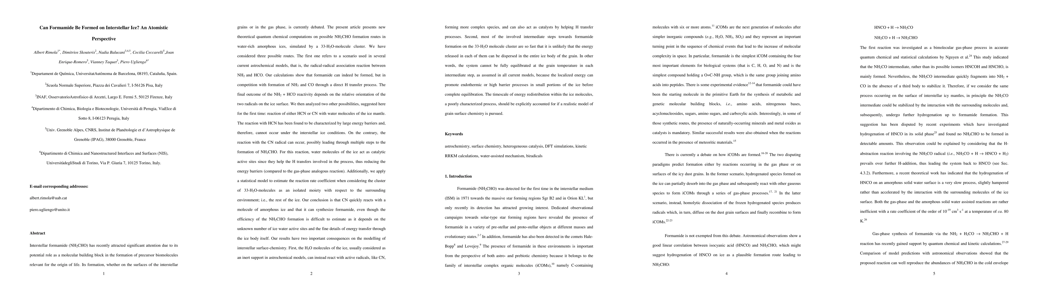 Researchers used quantum chemistry to study how formamide can be formed on interstellar ice, finding that it can occur through reactions involving radicals and water molecules, with one pathway involving the CN radical as a catalyst.