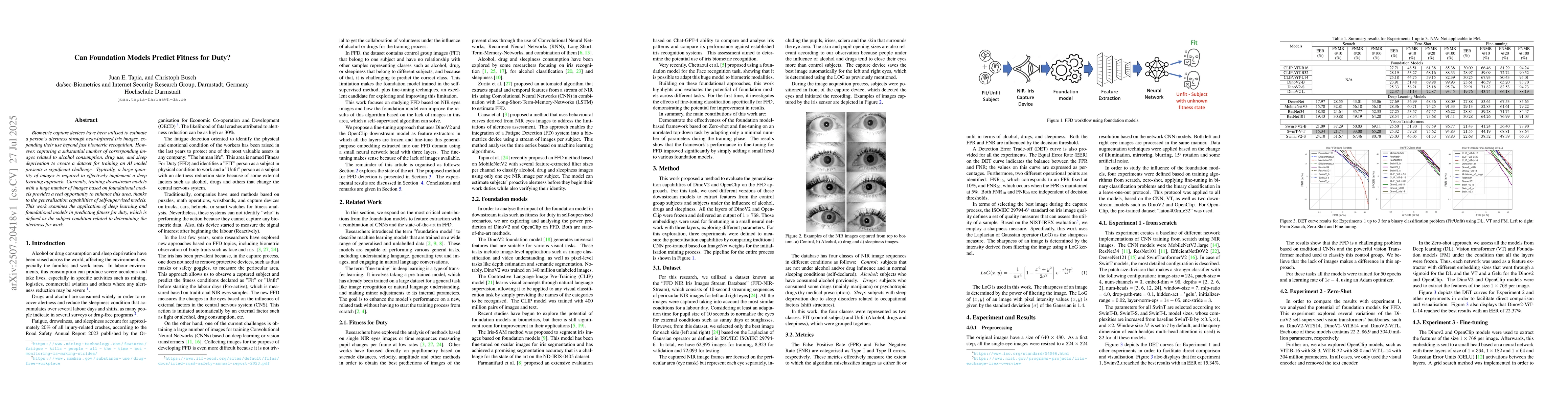 Biometric capture devices have been utilised to estimate a person's alertness through near-infrared iris images, expanding their use beyond just biometric recognition. However, capturing a substantial number of corresponding images related to alcohol consumption, drug use, and sleep deprivation to create a dataset for training an AI model presents a significant challenge. Typically, a large quantity of images is required to effectively implement a deep learning approach. Currently, training downstream models with a huge number of images based on foundational models provides a real opportunity to enhance this area, thanks to the generalisation capabilities of self-supervised models. This work examines the application of deep learning and foundational models in predicting fitness for duty, which is defined as the subject condition related to determining the alertness for work.