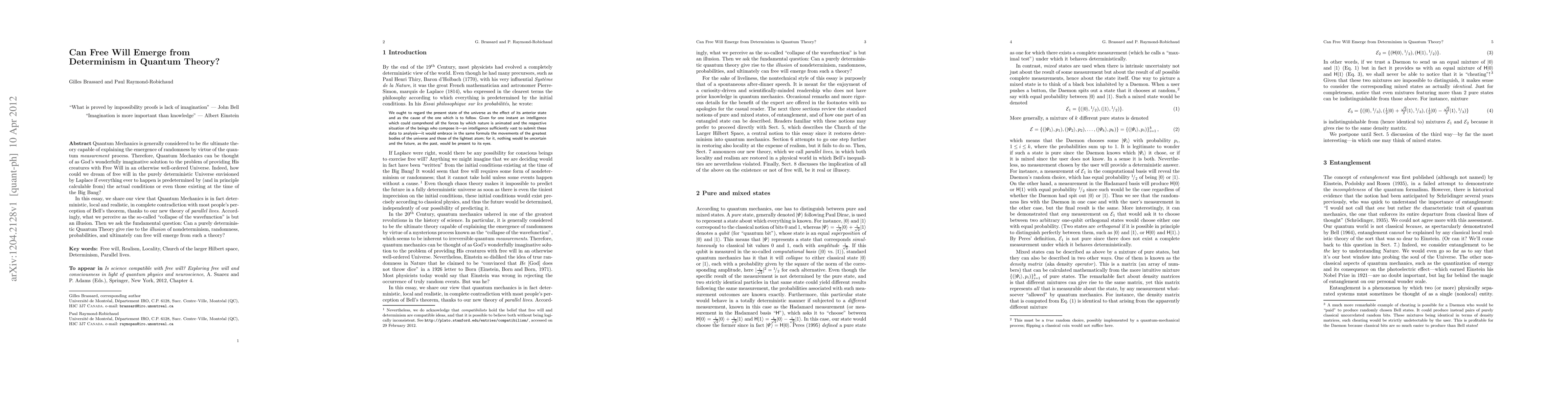 This paper explores whether free will can emerge from a deterministic quantum theory, arguing that despite the deterministic nature of quantum mechanics, the illusion of randomness and free will may arise from a new theory of parallel lives, challenging conventional interpretations.