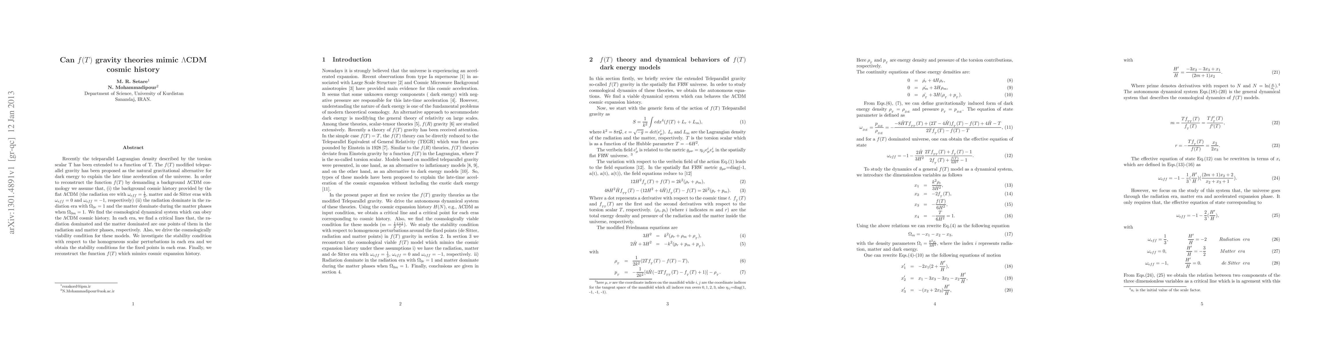 This paper explores whether $f(T)$ gravity, a modified teleparallel gravity theory, can replicate the cosmic history described by the $\Lambda$CDM model. The study reconstructs the function $f(T)$ to match the $\Lambda$CDM background cosmology and investigates the stability conditions for homogeneous scalar perturbations, ultimately finding a viable function that mimics the $\Lambda$CDM expansion history.