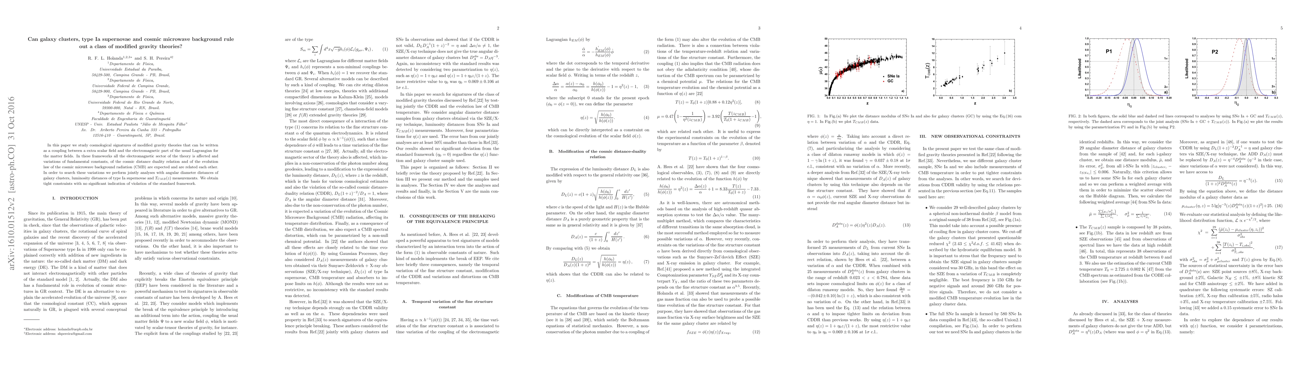 In this paper we study cosmological signatures of modified gravity theories that can be written as a coupling between a extra scalar field and the electromagnetic part of the usual Lagrangian for the matter fields. In these frameworks all the electromagnetic sector of the theory is affected and variations of fundamental constants, of the cosmic distance duality relation and of the evolution law of the cosmic microwave background radiation (CMB) are expected and are related each other. In order to search these variations we perform jointly analyses with angular diameter distances of galaxy clusters, luminosity distances of type Ia supernovae and $T_{CMB}(z)$ measurements. We obtain tight constraints with no indication of violation of the standard framework.