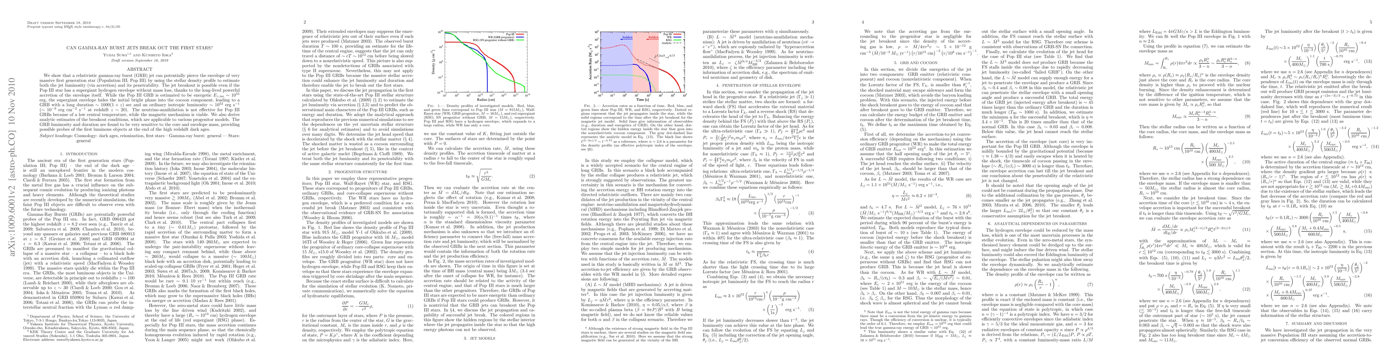 We show that a relativistic gamma-ray burst (GRB) jet can potentially pierce the envelope of very massive first generation star (Population III; Pop III) by using the stellar density profile to estimate both the jet luminosity (via accretion) and its penetrability. The jet breakout is possible even if the Pop III star has a supergiant hydrogen envelope without mass loss, thanks to the long-lived powerful accretion of the envelope itself. While the Pop III GRB is estimated to be energetic, E_{gamma,iso} ~ 10^{55} erg, the supergiant envelope hides the initial bright phase into the cocoon component, leading to a GRB with a long duration ~ 1000(1+z) sec and an ordinary isotropic luminosity ~ 10^{52} erg s^{-1} (~ 10^{-9} erg cm^{-2} s^{-1} at redshift z ~ 20). The neutrino-annihilation is not effective for Pop III GRBs because of a low central temperature, while the magnetic mechanism is viable. We also derive analytic estimates of the breakout conditions, which are applicable to various progenitor models. The GRB luminosity and duration are found to be very sensitive to the core and envelope mass, providing possible probes of the first luminous objects at the end of the high redshift dark ages.