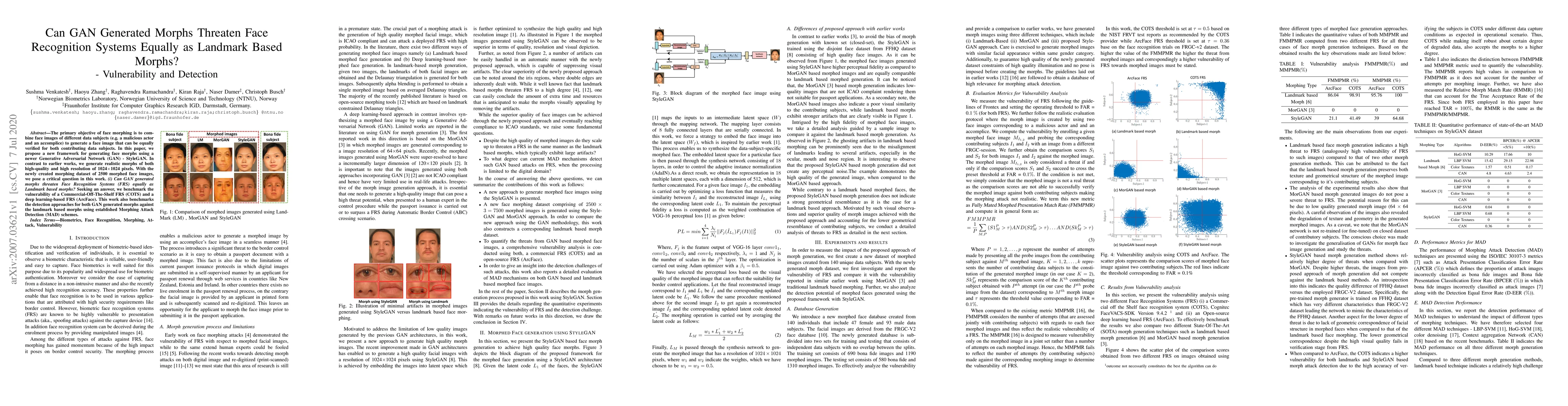 The primary objective of face morphing is to combine face images of different data subjects (e.g. a malicious actor and an accomplice) to generate a face image that can be equally verified for both contributing data subjects. In this paper, we propose a new framework for generating face morphs using a newer Generative Adversarial Network (GAN) - StyleGAN. In contrast to earlier works, we generate realistic morphs of both high-quality and high resolution of 1024$\times$1024 pixels. With the newly created morphing dataset of 2500 morphed face images, we pose a critical question in this work. \textit{(i) Can GAN generated morphs threaten Face Recognition Systems (FRS) equally as Landmark based morphs?} Seeking an answer, we benchmark the vulnerability of a Commercial-Off-The-Shelf FRS (COTS) and a deep learning-based FRS (ArcFace). This work also benchmarks the detection approaches for both GAN generated morphs against the landmark based morphs using established Morphing Attack Detection (MAD) schemes.