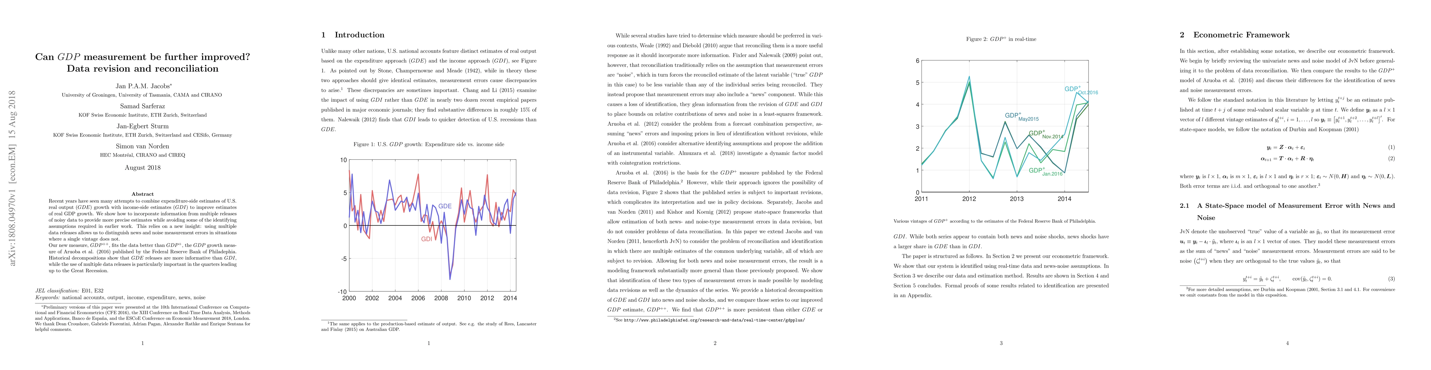 This paper proposes a new method, GDP++, to improve GDP measurement by combining expenditure-side and income-side estimates using multiple data releases to distinguish measurement errors. GDP++ provides more precise estimates than GDP+ and is particularly effective in quarters leading up to the Great Recession.