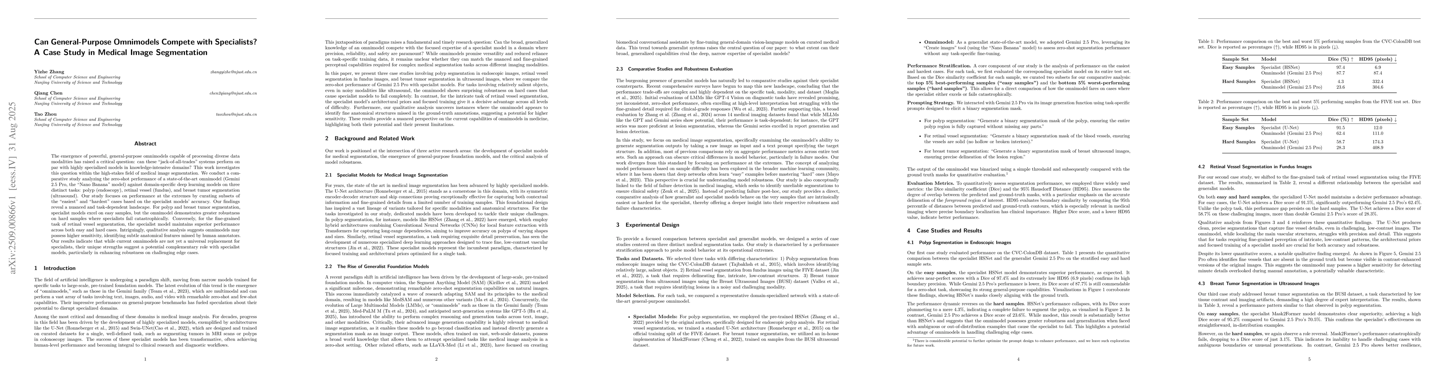 The emergence of powerful, general-purpose omnimodels capable of processing diverse data modalities has raised a critical question: can these ``jack-of-all-trades'' systems perform on par with highly specialized models in knowledge-intensive domains? This work investigates this question within the high-stakes field of medical image segmentation. We conduct a comparative study analyzing the zero-shot performance of a state-of-the-art omnimodel (Gemini 2.5 Pro, the ``Nano Banana'' model) against domain-specific deep learning models on three distinct tasks: polyp (endoscopy), retinal vessel (fundus), and breast tumor segmentation (ultrasound). Our study focuses on performance at the extremes by curating subsets of the ``easiest'' and ``hardest'' cases based on the specialist models' accuracy. Our findings reveal a nuanced and task-dependent landscape. For polyp and breast tumor segmentation, specialist models excel on easy samples, but the omnimodel demonstrates greater robustness on hard samples where specialists fail catastrophically. Conversely, for the fine-grained task of retinal vessel segmentation, the specialist model maintains superior performance across both easy and hard cases. Intriguingly, qualitative analysis suggests omnimodels may possess higher sensitivity, identifying subtle anatomical features missed by human annotators. Our results indicate that while current omnimodels are not yet a universal replacement for specialists, their unique strengths suggest a potential complementary role with specialist models, particularly in enhancing robustness on challenging edge cases.