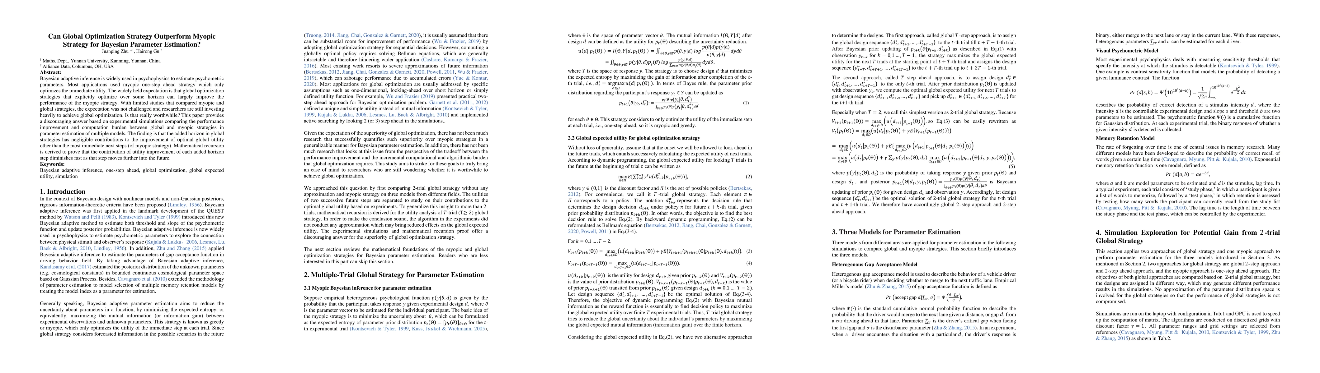 This paper finds that global optimization strategies for Bayesian parameter estimation offer negligible improvements over myopic strategies, despite the computational burden. The mathematical recursion shows diminishing returns on utility improvement as future steps are considered, suggesting that the benefits of global optimization are minimal beyond the immediate next steps.