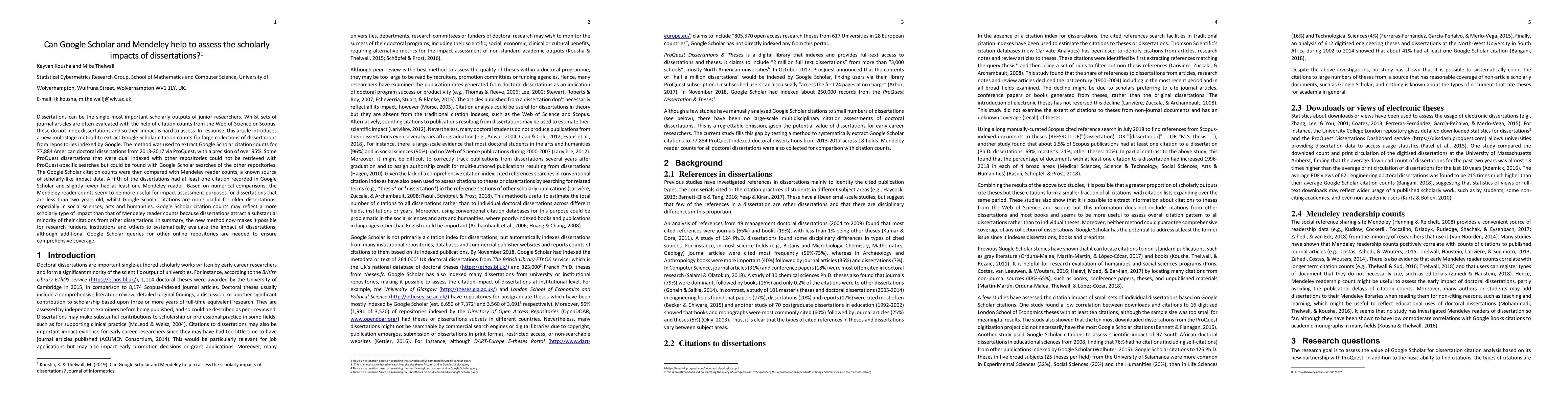 This study introduces a method to extract Google Scholar citation counts for dissertations from ProQuest, finding that Google Scholar citations are more useful for older dissertations, particularly in social sciences, arts, and humanities, while Mendeley reader counts better assess the impact of newer works. This method enables systematic impact assessment of dissertations.