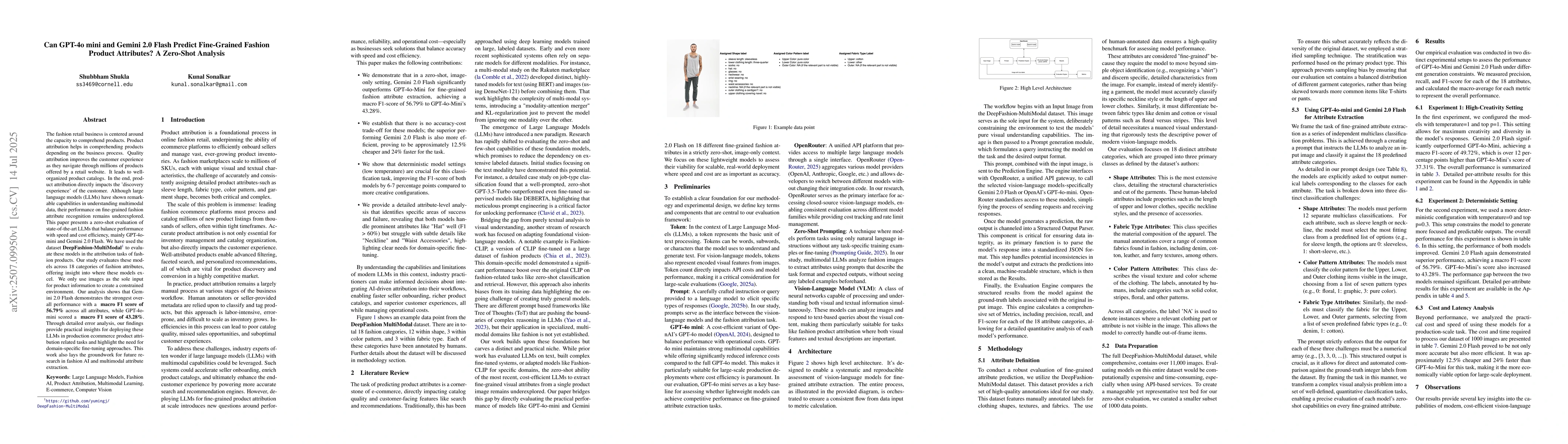 The fashion retail business is centered around the capacity to comprehend products. Product attribution helps in comprehending products depending on the business process. Quality attribution improves the customer experience as they navigate through millions of products offered by a retail website. It leads to well-organized product catalogs. In the end, product attribution directly impacts the 'discovery experience' of the customer. Although large language models (LLMs) have shown remarkable capabilities in understanding multimodal data, their performance on fine-grained fashion attribute recognition remains under-explored. This paper presents a zero-shot evaluation of state-of-the-art LLMs that balance performance with speed and cost efficiency, mainly GPT-4o-mini and Gemini 2.0 Flash. We have used the dataset DeepFashion-MultiModal (https://github.com/yumingj/DeepFashion-MultiModal) to evaluate these models in the attribution tasks of fashion products. Our study evaluates these models across 18 categories of fashion attributes, offering insight into where these models excel. We only use images as the sole input for product information to create a constrained environment. Our analysis shows that Gemini 2.0 Flash demonstrates the strongest overall performance with a macro F1 score of 56.79% across all attributes, while GPT-4o-mini scored a macro F1 score of 43.28%. Through detailed error analysis, our findings provide practical insights for deploying these LLMs in production e-commerce product attribution-related tasks and highlight the need for domain-specific fine-tuning approaches. This work also lays the groundwork for future research in fashion AI and multimodal attribute extraction.