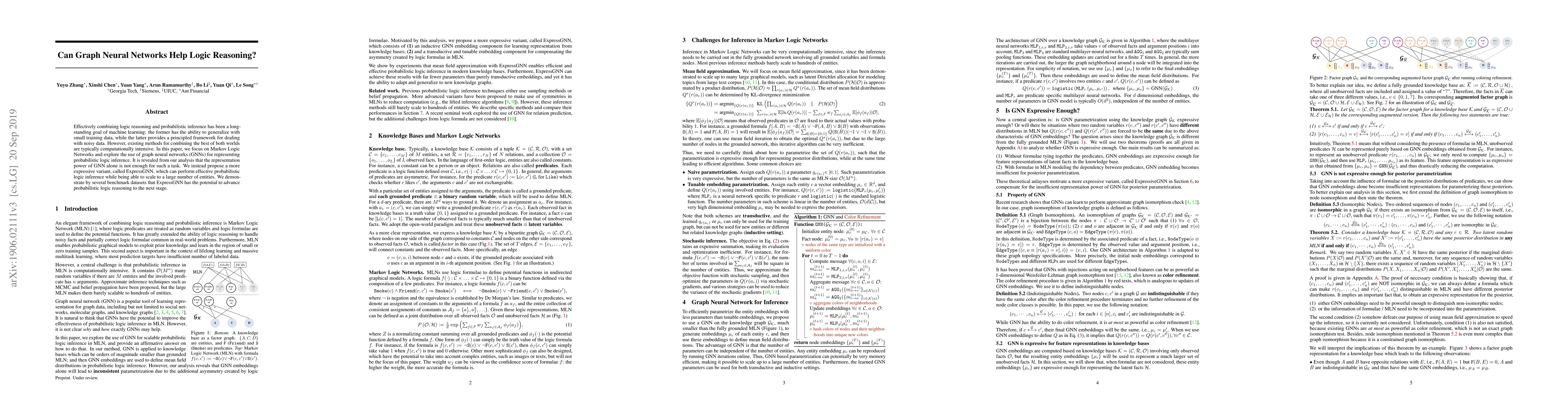 This paper investigates the use of graph neural networks (GNNs) for enhancing probabilistic logic inference in Markov Logic Networks, finding that standard GNNs lack sufficient representation power. It introduces ExpressGNN, a more expressive variant that successfully scales and improves logic reasoning performance on several datasets.