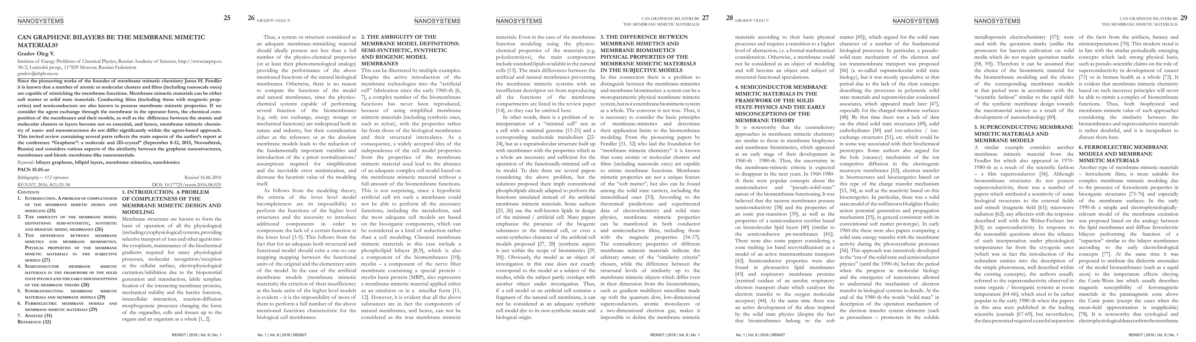 Since the pioneering works of the founder of membrane mimetic chemistry Janos H. Fendler it is known that a number of atomic or molecular clusters and films (including nanoscale ones) are capable of mimicking the membrane functions. Membrane mimetic materials can be either soft matter or solid state materials. Conducting films (including those with magnetic properties) and semiconductors are also known to possess membrane mimetic properties. If we consider the agent exchange through the membrane in the operator form, the chemical composition of the membranes and their models, as well as the difference between the atomic and molecular clusters or layers become not so essential, and hence, membrane mimetic chemistry of nano- and mesostructures do not differ significantly within the agent-based approach. This invited review containing several parts reflects the main aspects of the author's report at the conference "Graphene: a molecule and 2D-crystal" (September 8-12, 2015, Novosibirsk, Russia) and considers various aspects of the similarity between the graphene nanostructures, membranes and bionic membrane-like nanomaterials.