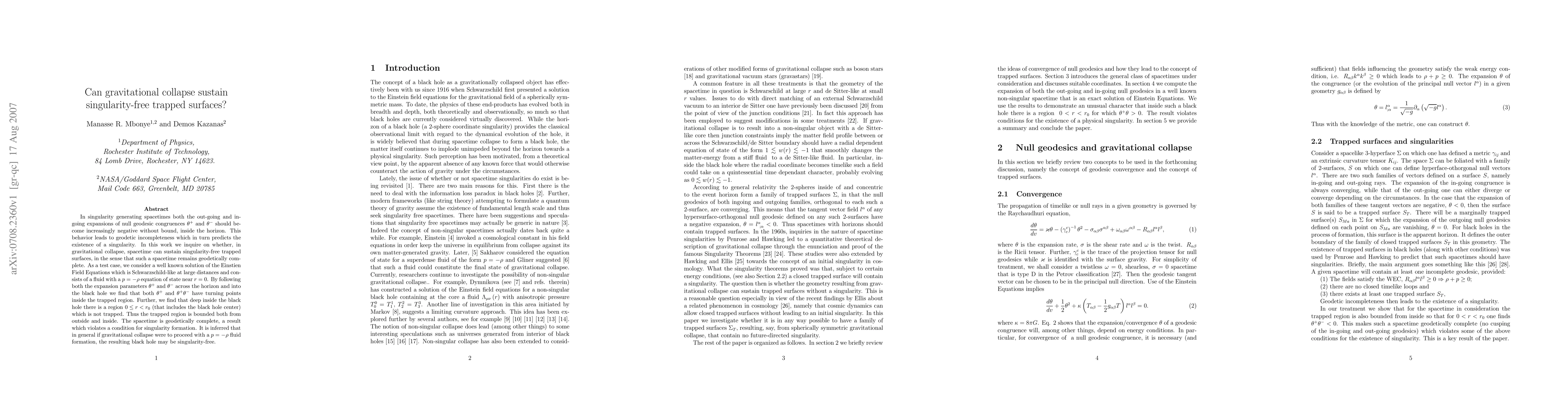 This paper investigates whether gravitational collapse can lead to singularity-free trapped surfaces, finding that a spacetime with a $p=-\rho$ fluid equation of state avoids singularity formation. The study reveals a region inside the black hole where trapped surfaces do not apply, indicating geodetic completeness and the absence of a singularity.