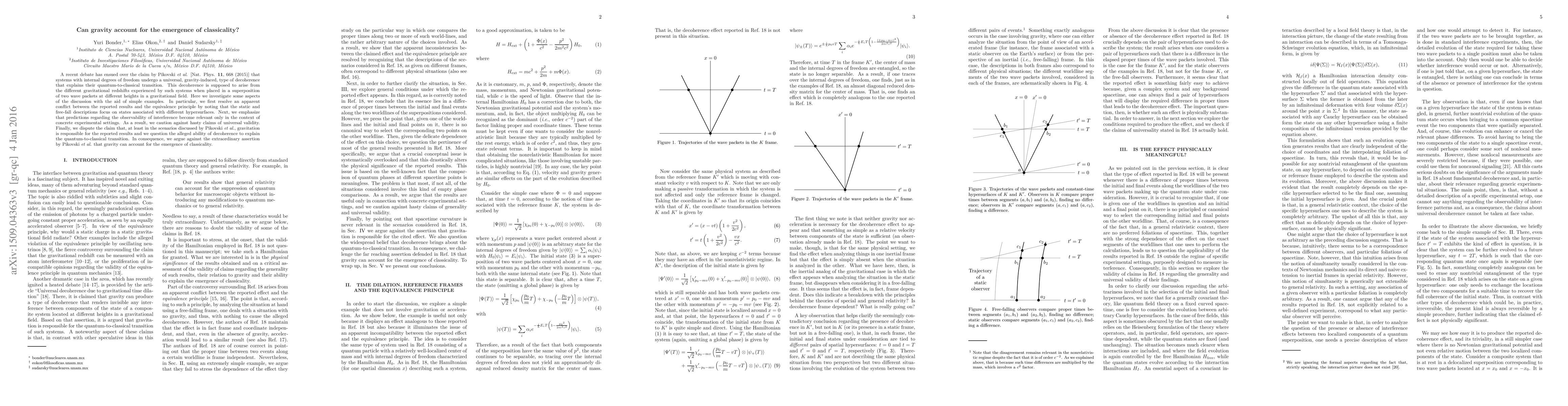 A recent debate has ensued over the claim by Pikovski et al. [Nat. Phys. 11, 668 (2015)] that systems with internal degrees of freedom undergo a universal, gravity-induced, type of decoherence that explains their quantum-to-classical transition. This decoherence is supposed to arise from the different gravitational redshifts experienced by such systems when placed in a superposition of two wave packets at different heights in a gravitational field. Here we investigate some aspects of the discussion with the aid of simple examples. In particular, we first resolve an apparent conflict between the reported results and the equivalence principle by noting that the static and free-fall descriptions focus on states associated with different hypersurfaces. Next, we emphasize that predictions regarding the observability of interference become relevant only in the context of concrete experimental settings. As a result, we caution against hasty claims of universal validity. Finally, we dispute the claim that, at least in the scenarios discussed by Pikovski et al., gravitation is responsible for the reported results, and we question the alleged ability of decoherence to explain the quantum-to-classical transition. In consequence, we argue against the extraordinary assertion by Pikovski et al. that gravity can account for the emergence of classicality.