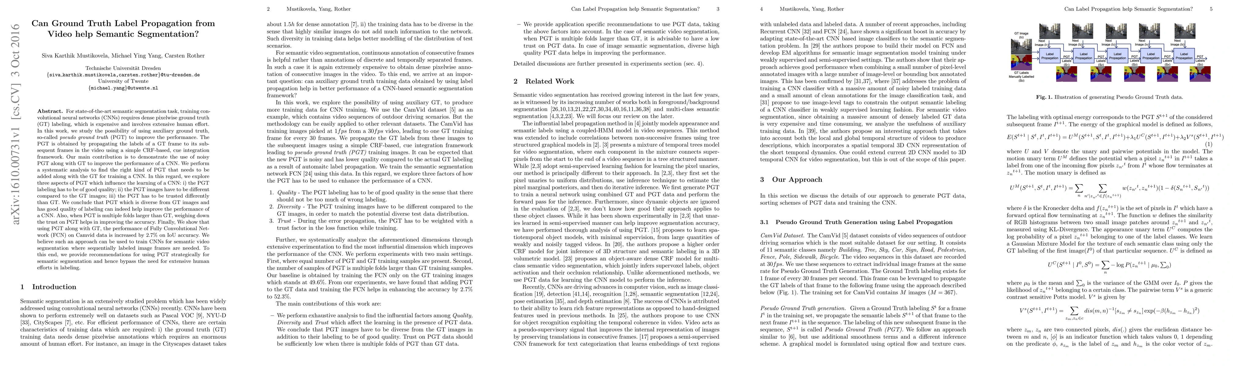 This research explores the potential of using ground truth label propagation from video frames to enhance semantic segmentation performance. The study demonstrates that combining pseudo ground truth (PGT) labels, which are derived from propagating labels from a labeled frame to subsequent frames, with actual ground truth labels can improve convolutional neural network training efficiency. The authors found that high-quality, diverse PGT labels, when appropriately weighted, can boost the accuracy of Fully Convolutional Networks, achieving a $2.7\%$ increase in Intersection over Union (IoU) accuracy on Camvid data.