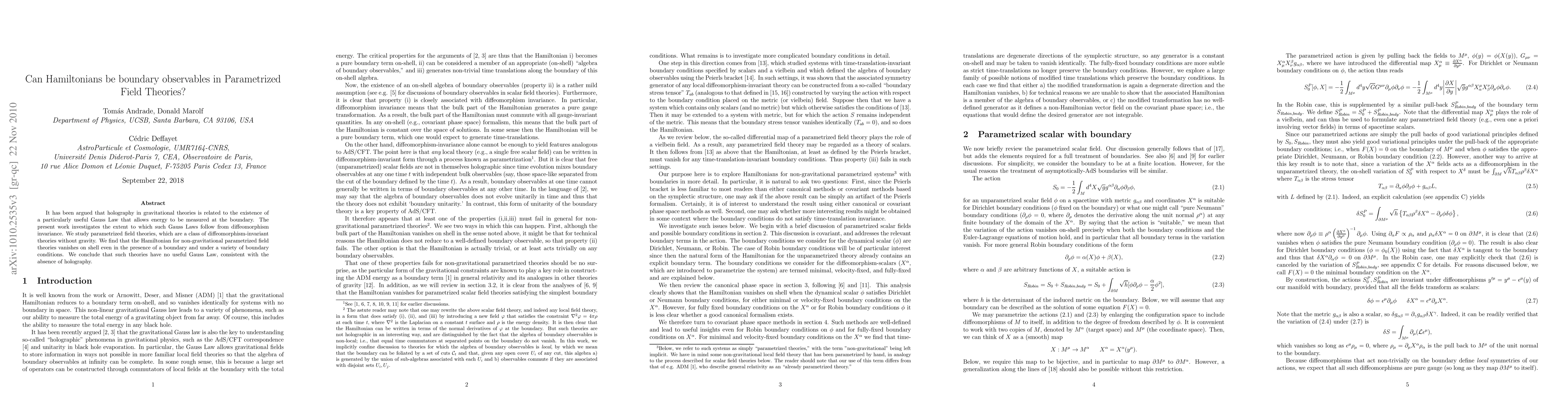 It has been argued that holography in gravitational theories is related to the existence of a particularly useful Gauss Law that allows energy to be measured at the boundary. The present work investigates the extent to which such Gauss Laws follow from diffeomorphism invariance. We study parametrized field theories, which are a class of diffeomorphism-invariant theories without gravity. We find that the Hamiltonian for parametrized field theories vanishes on shell even in the presence of a boundary and under a variety of boundary conditions. We conclude that parametrized theories have no useful Gauss Law, consistent with the absence of holography in these theories.