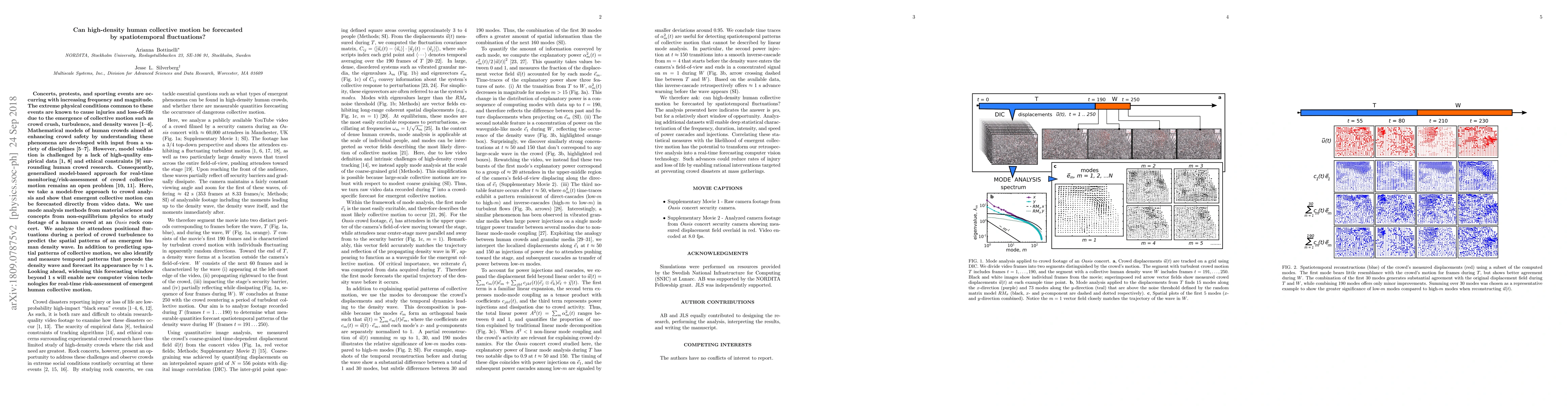 Concerts, protests, and sporting events are occurring with increasing frequency and magnitude. The extreme physical conditions common to these events are known to cause injuries and loss-of-life due to the emergence of collective motion such as crowd crush, turbulence, and density waves. Mathematical models of human crowds aimed at enhancing crowd safety by understanding these phenomena are developed with input from a variety of disciplines. However, model validation is challenged by a lack of high-quality empirical data and ethical constraints surrounding human crowd research. Consequently, generalized model-based approach for real-time monitoring/risk-assessment of crowd collective motion remains an open problem. Here, we take a model-free approach to crowd analysis and show that emergent collective motion can be forecasted directly from video data. We use mode analysis methods from material science and concepts from non-equilibrium physics to study footage of a human crowd at an Oasis rock concert. We analyze the attendees positional fluctuations during a period of crowd turbulence to predict the spatial patterns of an emergent human density wave. In addition to predicting spatial patterns of collective motion, we also identify and measure temporal patterns that precede the density wave and forecast its appearance by 1~s. Looking ahead, widening this forecasting window beyond 1~s will enable new computer vision technologies for real-time risk-assessment of emergent human collective motion.