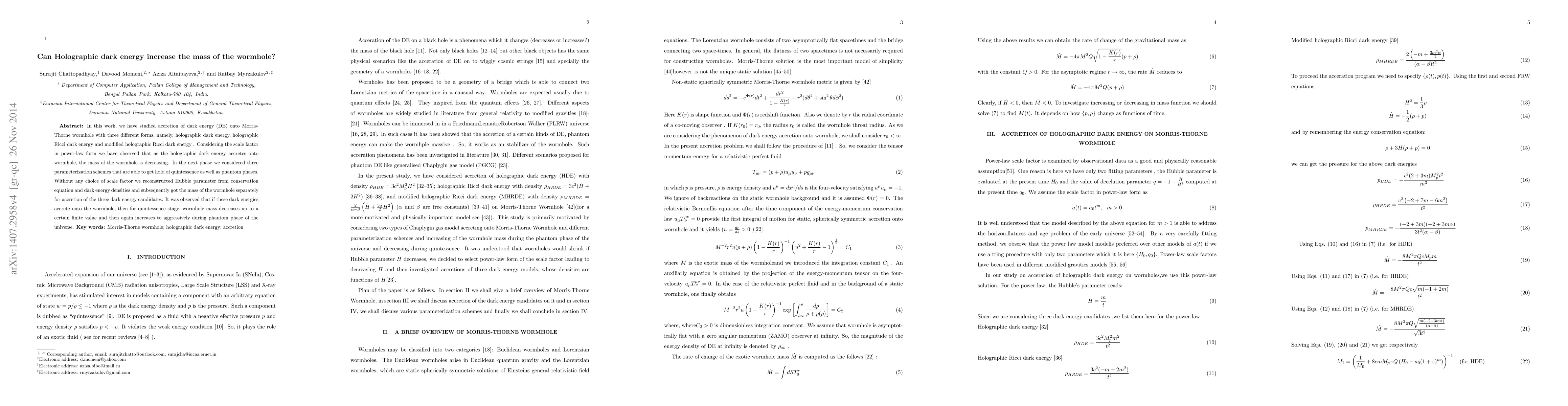 This paper examines the accretion of three forms of holographic dark energy onto a Morris-Thorne wormhole, finding that holographic dark energy decreases the wormhole's mass, while during quintessence and phantom phases, the wormhole mass initially decreases but later increases aggressively.