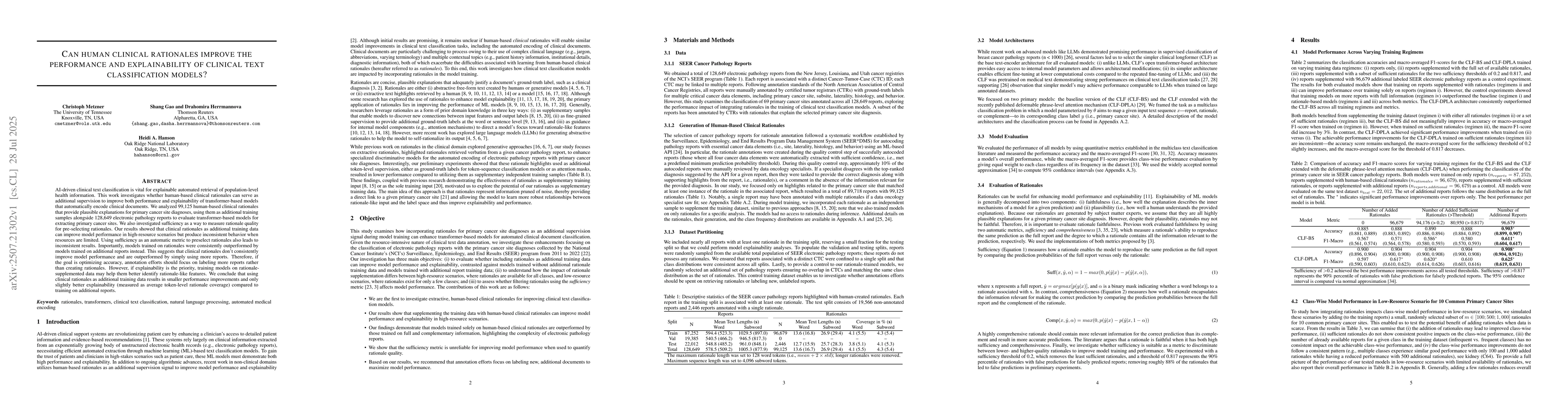 AI-driven clinical text classification is vital for explainable automated retrieval of population-level health information. This work investigates whether human-based clinical rationales can serve as additional supervision to improve both performance and explainability of transformer-based models that automatically encode clinical documents. We analyzed 99,125 human-based clinical rationales that provide plausible explanations for primary cancer site diagnoses, using them as additional training samples alongside 128,649 electronic pathology reports to evaluate transformer-based models for extracting primary cancer sites. We also investigated sufficiency as a way to measure rationale quality for pre-selecting rationales. Our results showed that clinical rationales as additional training data can improve model performance in high-resource scenarios but produce inconsistent behavior when resources are limited. Using sufficiency as an automatic metric to preselect rationales also leads to inconsistent results. Importantly, models trained on rationales were consistently outperformed by models trained on additional reports instead. This suggests that clinical rationales don't consistently improve model performance and are outperformed by simply using more reports. Therefore, if the goal is optimizing accuracy, annotation efforts should focus on labeling more reports rather than creating rationales. However, if explainability is the priority, training models on rationale-supplemented data may help them better identify rationale-like features. We conclude that using clinical rationales as additional training data results in smaller performance improvements and only slightly better explainability (measured as average token-level rationale coverage) compared to training on additional reports.