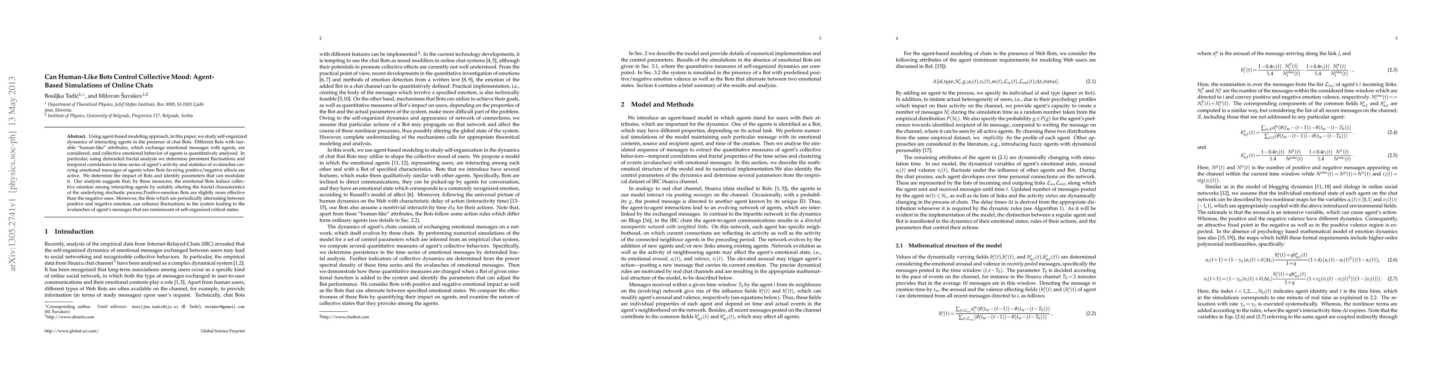 This paper uses agent-based modeling to investigate how chat Bots with human-like attributes influence the collective mood of online chat participants. The study finds that Bots favoring positive emotions are more effective in inducing collective emotional behavior, while alternating Bots can enhance system fluctuations and lead to self-organized critical states.