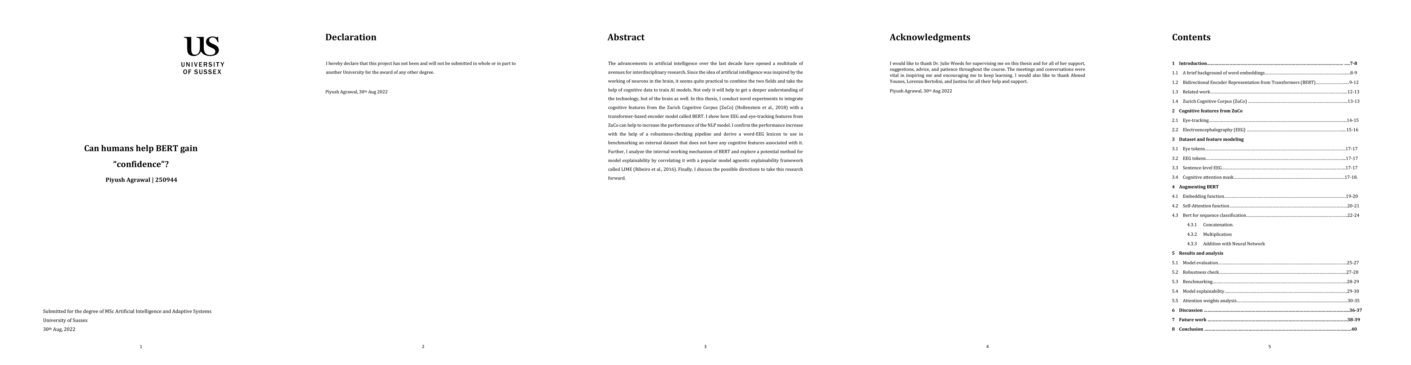 This paper explores integrating cognitive features from the Zurich Cognitive Corpus with BERT to enhance its performance, demonstrating a performance boost using EEG and eye-tracking data. It also investigates BERT's internal workings and proposes a method for model explainability using LIME.