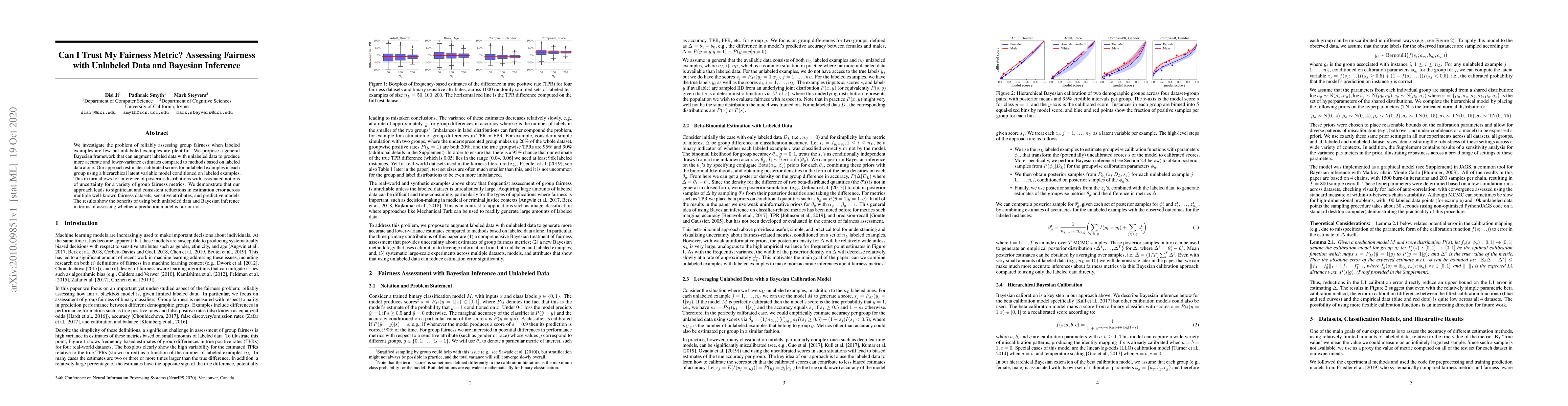 We investigate the problem of reliably assessing group fairness when labeled examples are few but unlabeled examples are plentiful. We propose a general Bayesian framework that can augment labeled data with unlabeled data to produce more accurate and lower-variance estimates compared to methods based on labeled data alone. Our approach estimates calibrated scores for unlabeled examples in each group using a hierarchical latent variable model conditioned on labeled examples. This in turn allows for inference of posterior distributions with associated notions of uncertainty for a variety of group fairness metrics. We demonstrate that our approach leads to significant and consistent reductions in estimation error across multiple well-known fairness datasets, sensitive attributes, and predictive models. The results show the benefits of using both unlabeled data and Bayesian inference in terms of assessing whether a prediction model is fair or not.
