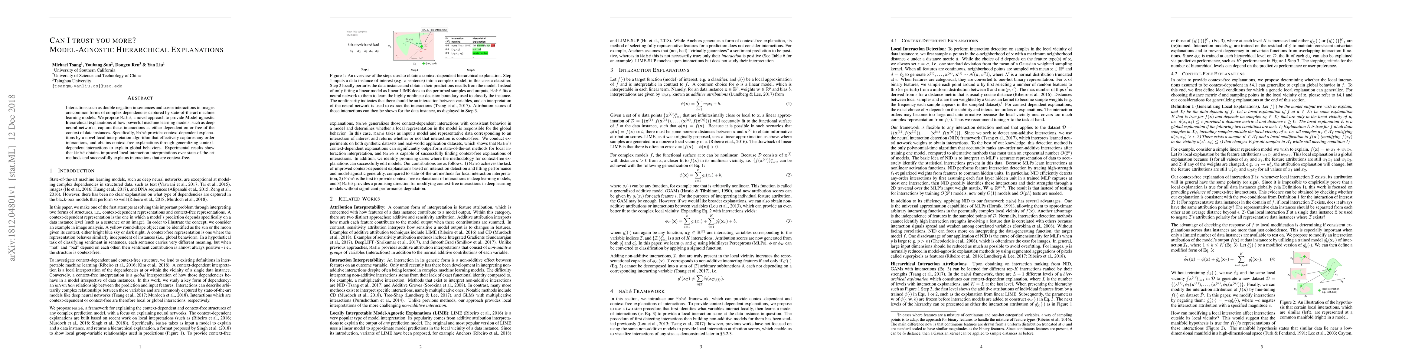 Interactions such as double negation in sentences and scene interactions in images are common forms of complex dependencies captured by state-of-the-art machine learning models. We propose Mah\'e, a novel approach to provide Model-agnostic hierarchical \'explanations of how powerful machine learning models, such as deep neural networks, capture these interactions as either dependent on or free of the context of data instances. Specifically, Mah\'e provides context-dependent explanations by a novel local interpretation algorithm that effectively captures any-order interactions, and obtains context-free explanations through generalizing context-dependent interactions to explain global behaviors. Experimental results show that Mah\'e obtains improved local interaction interpretations over state-of-the-art methods and successfully explains interactions that are context-free.