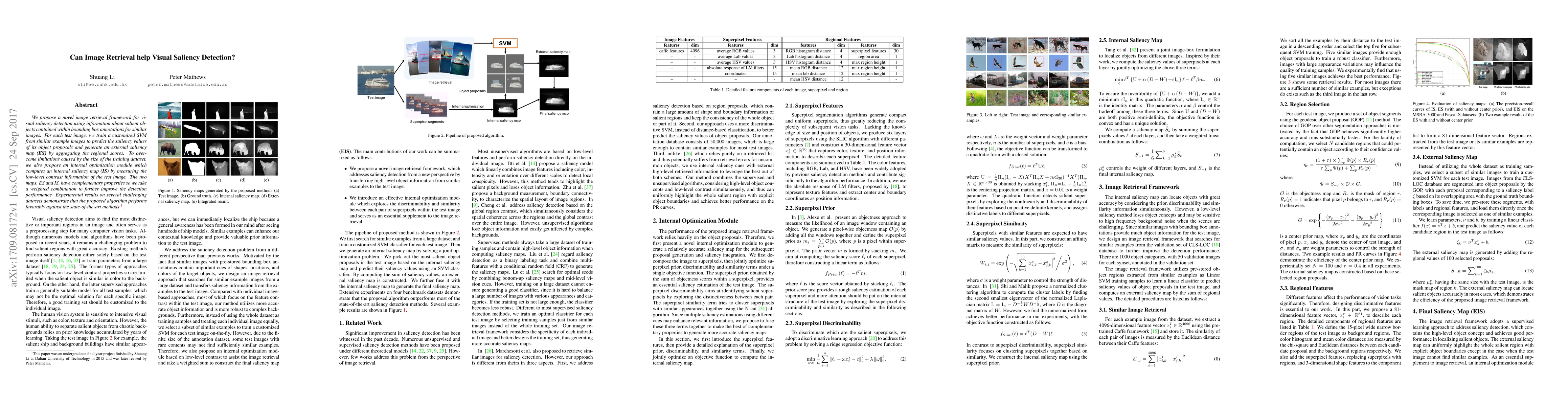 This paper proposes an image retrieval framework for visual saliency detection using salient object information from bounding box annotations of similar images. It combines external saliency maps generated from trained SVMs and internal saliency maps derived from low-level contrast to improve detection performance, outperforming state-of-the-art methods on several datasets.