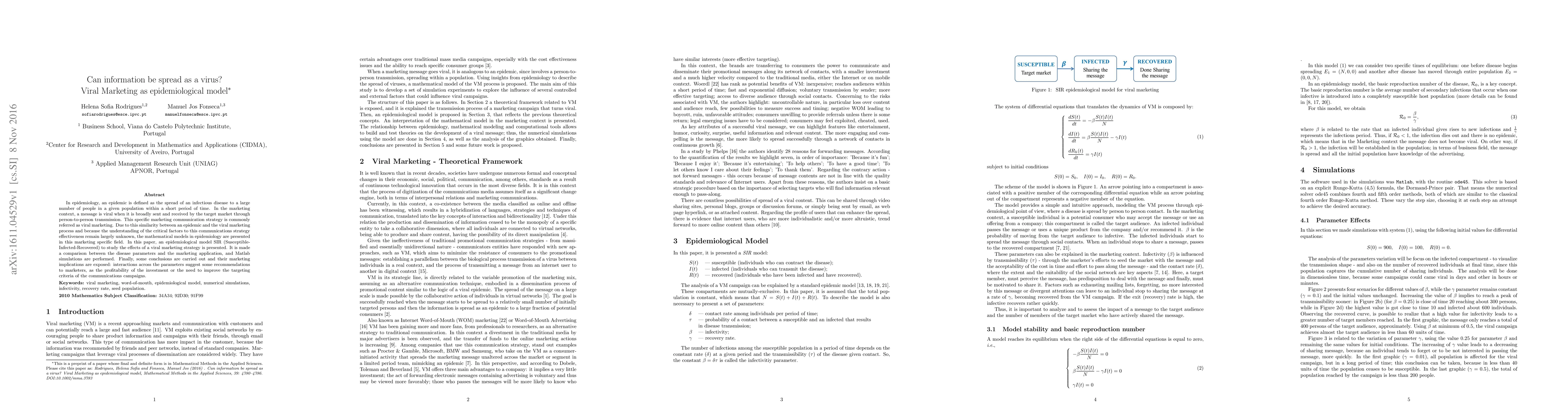 This paper explores the application of epidemiological models, specifically the SIR model, to understand viral marketing strategies. It compares disease spread parameters with marketing dynamics and uses MATLAB simulations to derive recommendations for improving marketing campaign targeting and profitability.